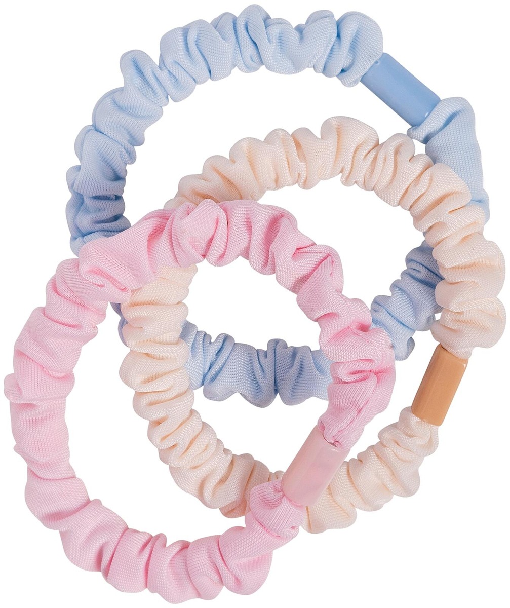 Trendikäs hiuslenkkisetti, jossa 3 kpl ohuita punottuja vaaleansinisen, vaaleanpunaisen sekä kerman värisiä hiuslenkkejä. Hiuslenkin halkaisija n. 6 cm. Materiaali punottu lanka, muovi.