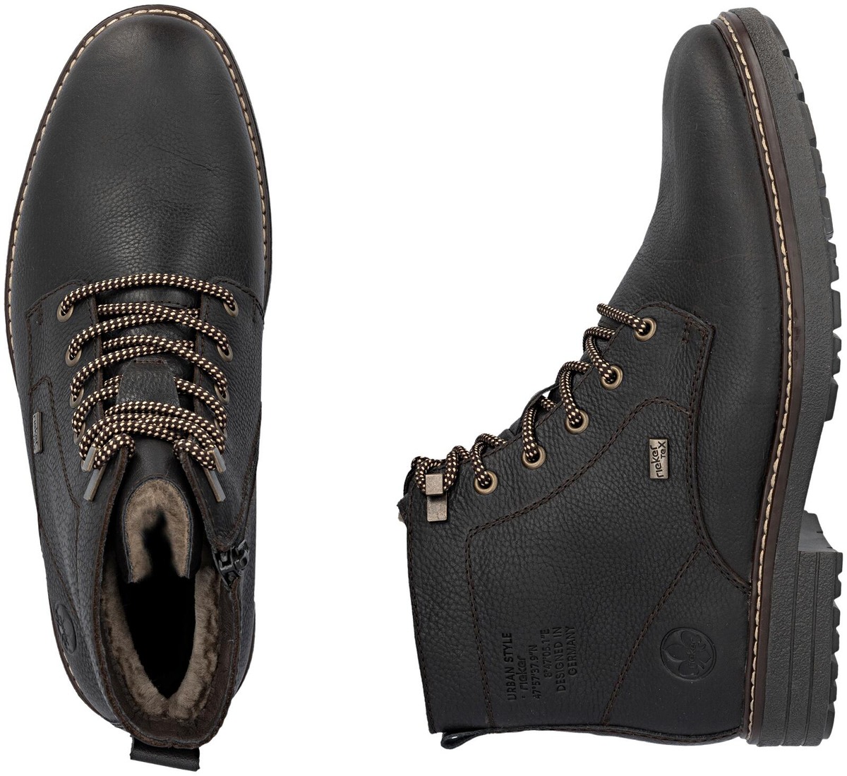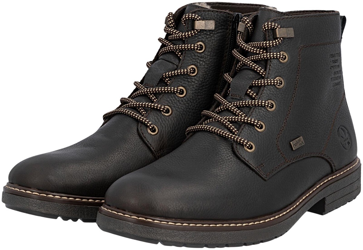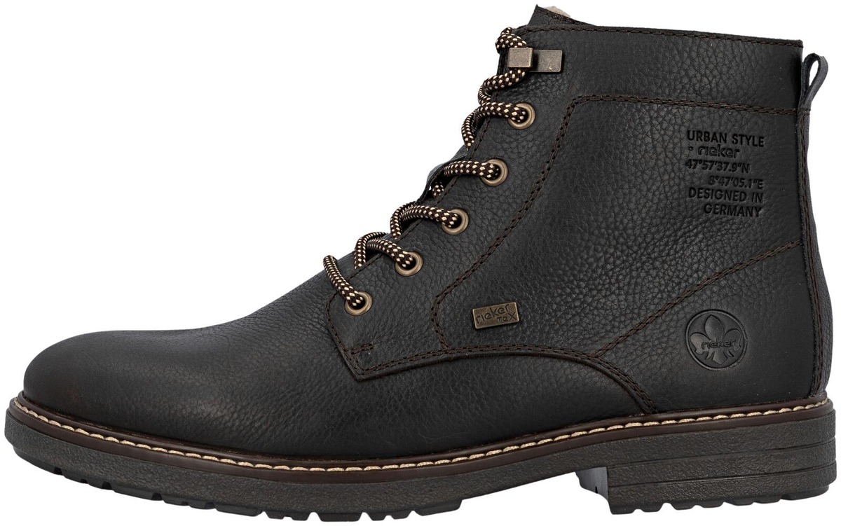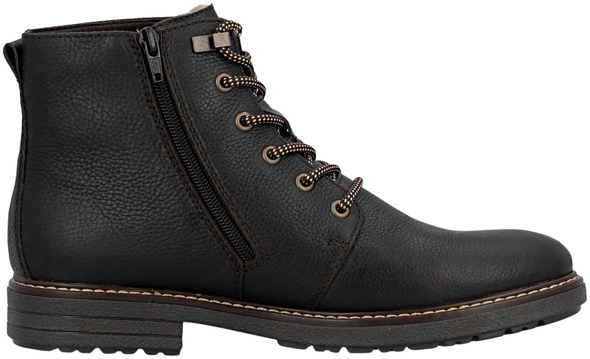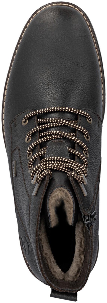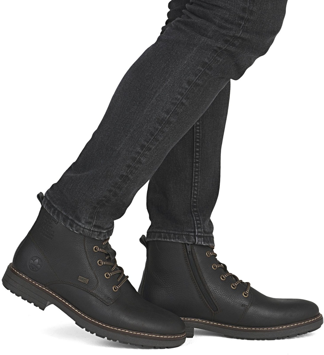 Miesten nahkaiset nilkkurit joissa nauhat, vetoketjut sisäreunassa, pehmeät pohjalliset, aito turkisvuori ja RiekerTEX-kalvo. Reilu lesti.