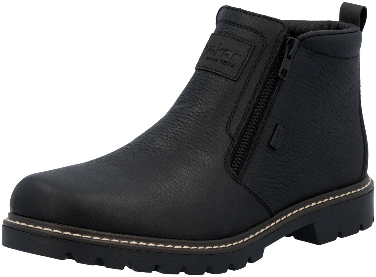 Miesten nahkaiset nilkkurit joissa vetoketjut sisä- ja ulkoreunassa, pehmeät pohjalliset, villavuori, kitkapohjat ja RiekerTEX-kalvo. Reilu lesti.