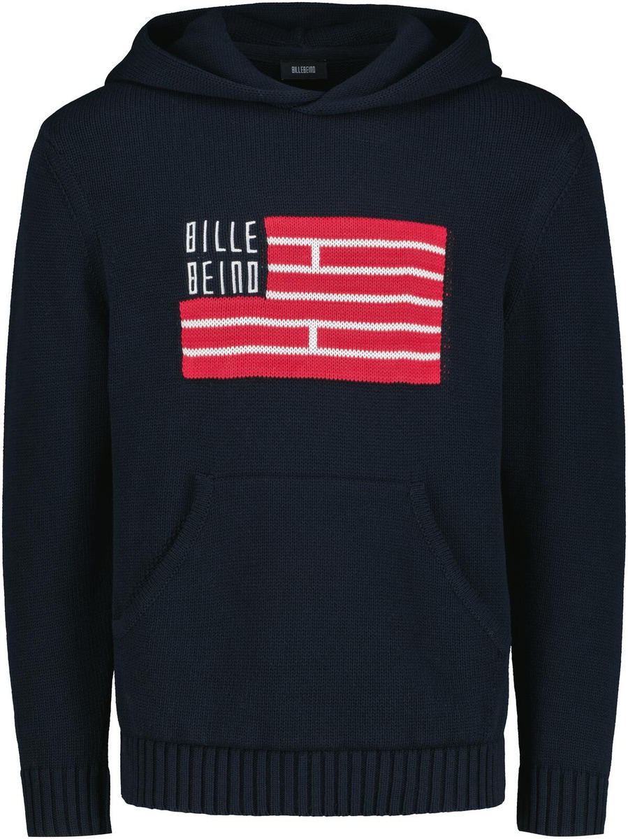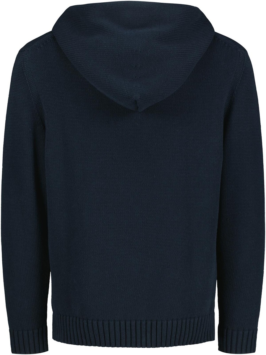 Neulottu huppari, jossa on kengurutasku edessä, logo kirjailu edessä.