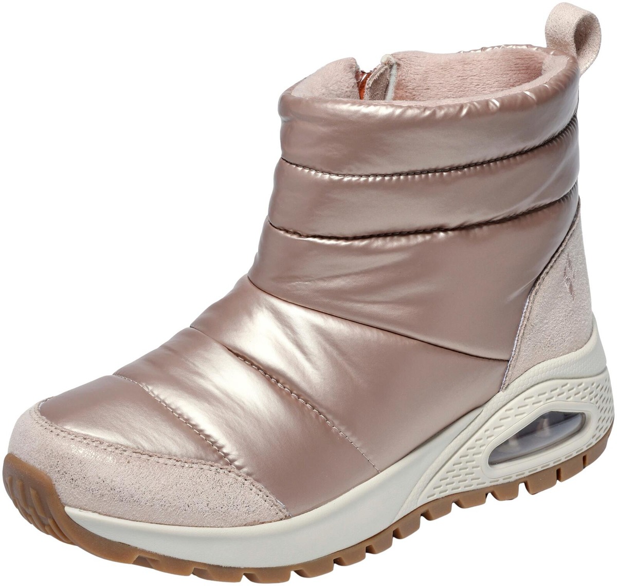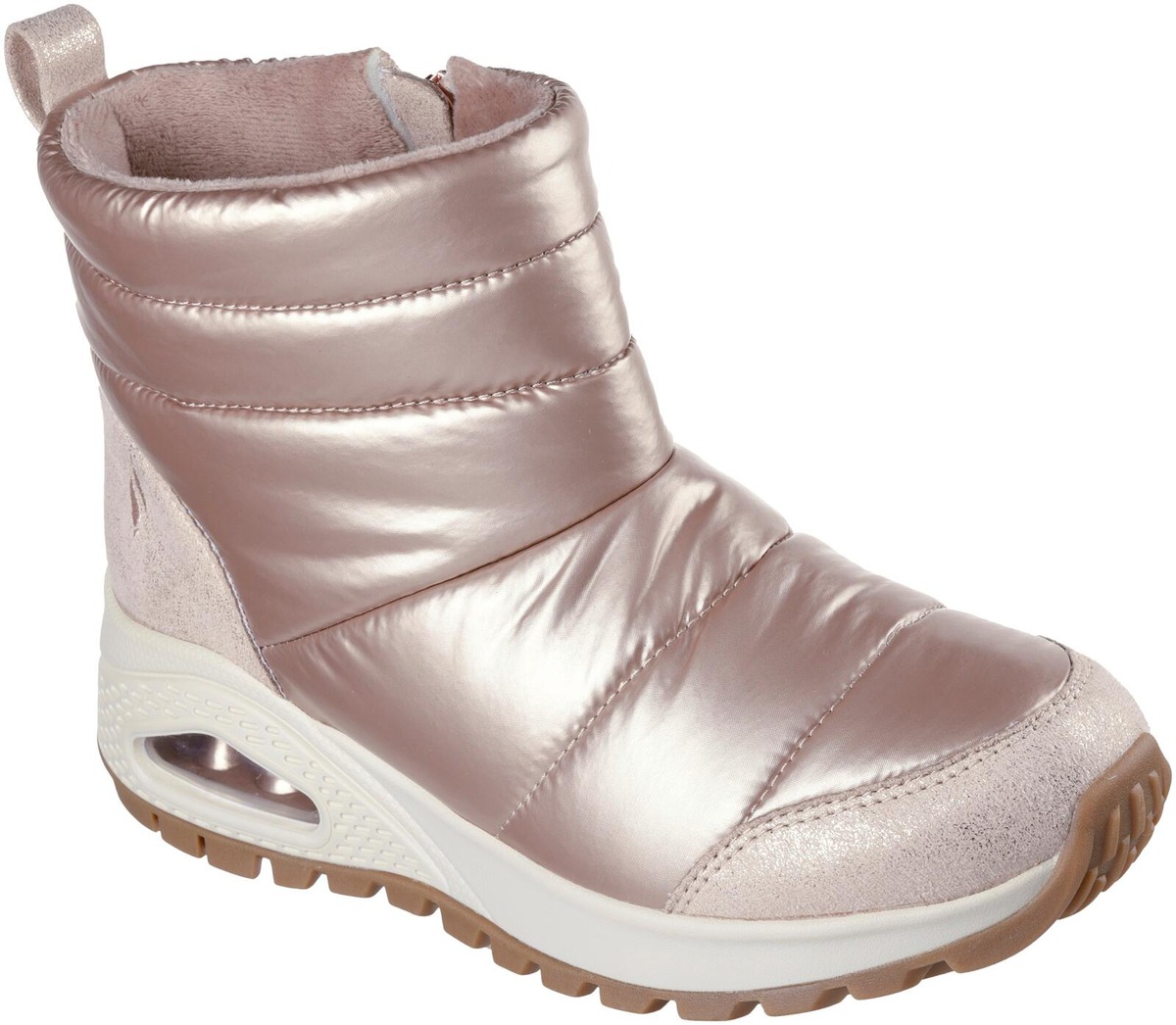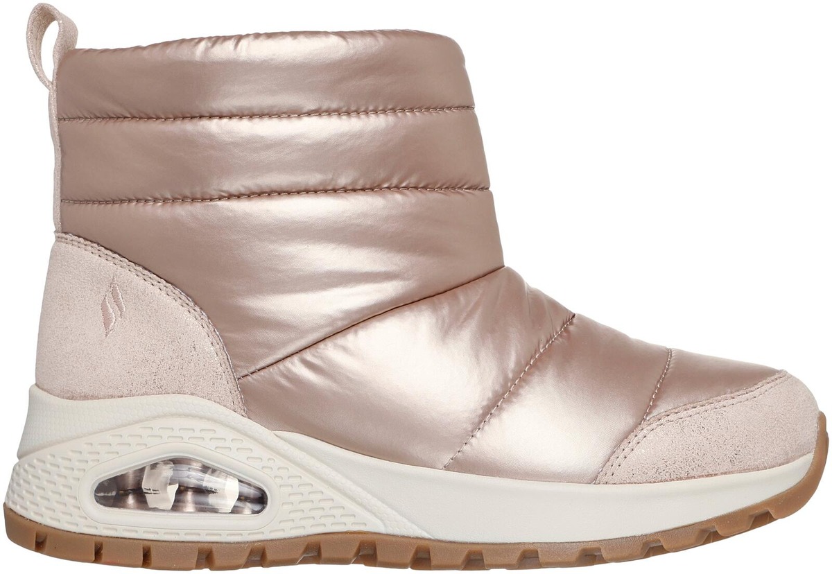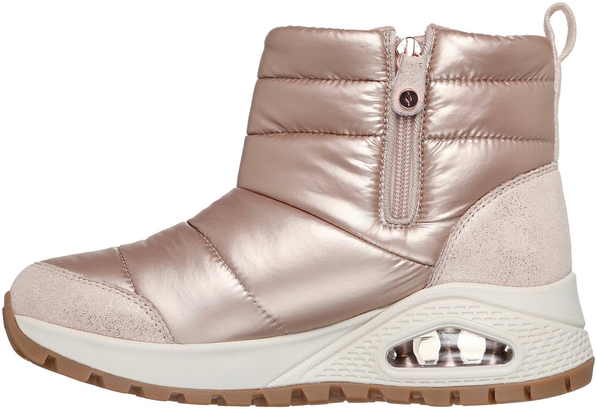 Suosittu UNO-kenkä talvisena versiona. Tällä talvijalkineella ulkoilu sujuu tyylikkäästi ja lämpimästi. Upeasti kiiltopintainen kenkä on näyttävä ja tyylikäs valinta, kengästä löytyvät Uno-kengälle tutut näkyvä Skech-Air - ilmatyyny ja Skechers Air-Cooled Memory Foam -sisäpohjallinen.