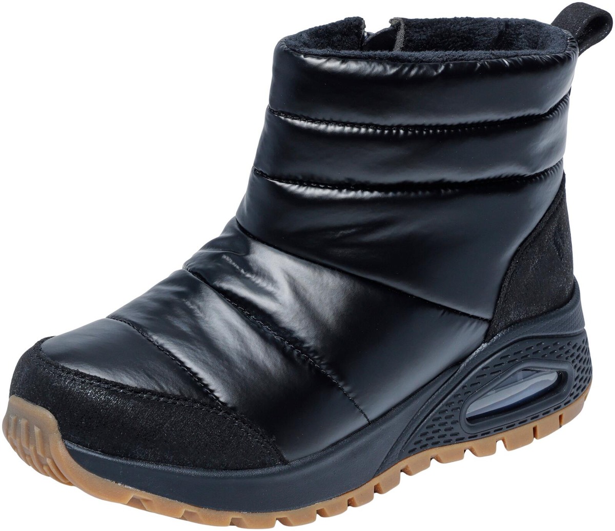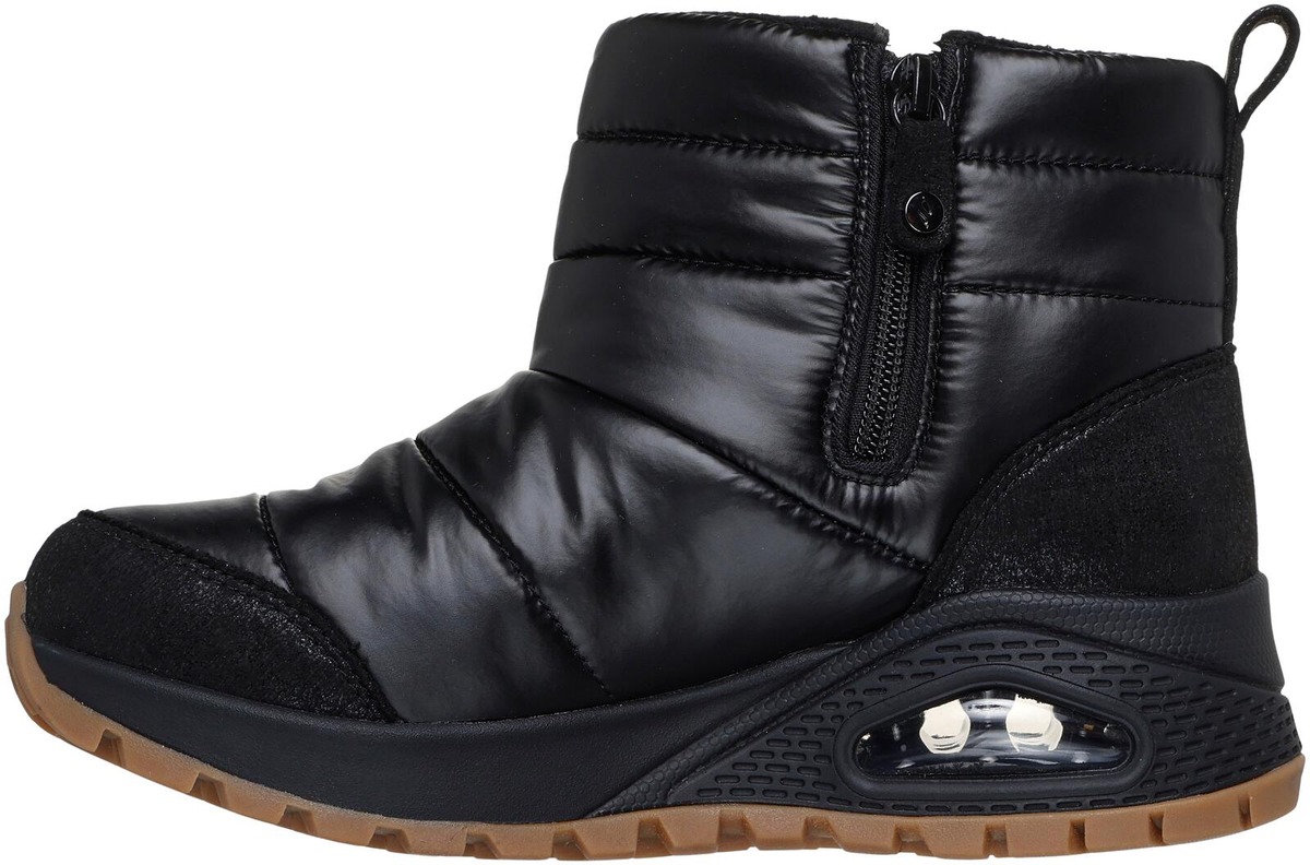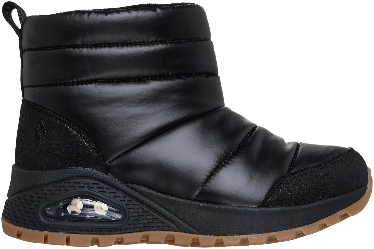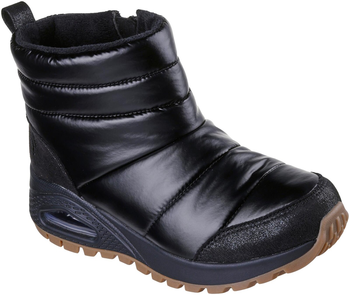 Suosittu UNO-kenkä talvisena versiona. Tällä talvijalkineella ulkoilu sujuu tyylikkäästi ja lämpimästi. Upeasti kiiltopintainen kenkä on näyttävä ja tyylikäs valinta, kengästä löytyvät Uno-kengälle tutut näkyvä Skech-Air - ilmatyyny ja Skechers Air-Cooled Memory Foam -sisäpohjallinen.