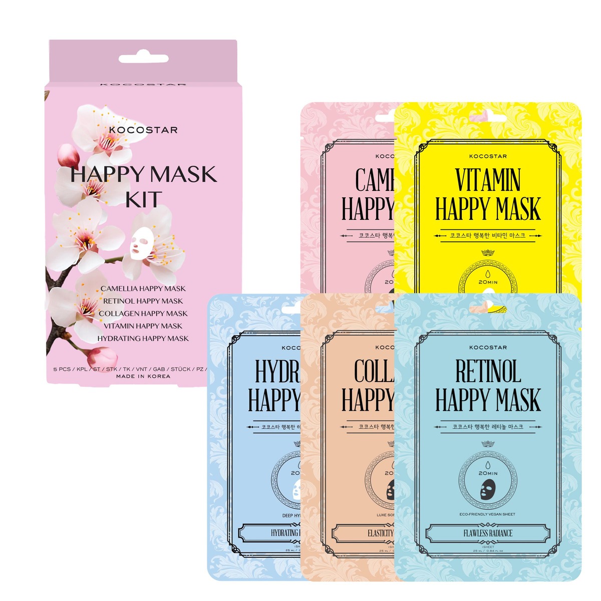 Camellia Happy Mask : Water/Aqua Glycerin, Butylene Glycol, Propanediol, Alcohol Denat., 1,2-Hexanediol, Olive Oil Glycereth-8 Esters, Polysorbate 80, Phenoxyethanol, Carbomer, Arginine, Disodium EDTA, Ethylhexylglycerin, Hydroxyethylcellulose, Fragrance/Parfum, Sodium Hyaluronate, Camellia Japonica Seed Oil, Aloe Barbadensis Leaf Water, Aloe Barbadensis Leaf Extract, Ginkgo Biloba Leaf Extract, Portulaca Oleracea Extract, Centella Asiatica Extract, Camellia Japonica Flower Extract, Camellia Sinensis Leaf Extract, Polysorbate 60, Disodium Phosphate, Caprylic/Capric Triglyceride, Tocopherol, Sodium Phosphate, Pentylene Glycol, Hydrogenated Lecithin, Caprylyl Glycol, Ceramide NP|Hydrating Happy Mask : Aqua, Glycerin, PEG/PPG-17/6 Copolymer, Butylene Glycol, PEG-60 Hydrogenated Castor Oil, Carbomer, Arginine, Cellulose Gum, 1,2-Hexanediol, Caprylyl Glycol, Sea Water, Illicium Verum (Anise) Fruit Extract, Octyldodecanol, Disodium EDTA, Parfum, Hydrogenated Lecithin, Laminaria Japonica Extract, Chlorella Vulgaris Extract, Porphyra Yezonensis Extract, Lactobacillus Ferment Lysate, Phaseolus Radiatus Seed Extract, Canavalia Gladiata Seed Extract, Glysine Soya (Soybean) Seed Extract, Lens Esculenta (Lentil) Seed Extract, Ceratonia Siliqua (Carob) Seed Extract, Pueraria Lobata Root Extract, Sodium Hyaluronate, Ceramide NP, Pentylene Glycol, Saussurea Involucrata Extract|Vitamin Happy Mask : Aqua/Water, Glycerin, Butylene Glycol, Propanediol, 1,2-Hexanediol, Hydroxyacetophenone, Hydroxyethylcellulose, Hexylene Glycol, Arginine, Carbomer, Disodium EDTA, Parfum/Fragrance, Polyglyceryl-10 Laurate, Polyglyceryl-10 Myristate, Betaine, Dipropylene Glycol, Magnesium Ascorbyl Phosphate, Sodium Hyaluronate, Tocopheryl Acetate, Polyglyceryl-4 Caprate, Niacinamide, Panthenol, Sodium Ascorbyl Phosphate, Inositol, Caprylyl Glycol, Tocopherol|Collagen Happy Mask : Water/Aqua, Glycerin, Caprylic/Capric Triglyceride, Cetyl Ethylhexanoate, Polyglyceryl-3 Methylglucose Distearate, Betaine, Prunus Amygdalus Dulcis (Sweet Almond) Oil, Dipropylene Glycol, Hydroxyacetophenone, Carbomer, Cetearyl Olivate, 1,2-Hexanediol, Butylene Glycol, Sorbitan Olivate, Xanthan Gum, Caprylyl Glycol, Illicium Verum (Anise) Fruit Extract, Fragrance/Parfum, Sodium Gluconate, Sodium Hydroxide, Scutellaria Baicalensis Root Extract, Ascophyllum Nodosum Extract, Epilobium Angustifolium Flower/Leaf/Stem Extract, Dipotassium Glycyrrhizate, Fucus Vesiculosus Extract, Prunella Vulgaris Extract, Chenopodium Quinoa Seed Extract, Daucus Carota Sativa (Carrot) Root Extract, Glycine Max (Soybean) Seed Extract, Oryza Sativa (Rice) Extract, Panax Ginseng Root Extract, Palmitoyl Tripeptide-5|Retinol Happy Mask : Water/Aqua, Glycerin, Butylene Glycol, Dipropylene Glycol, Betaine, Xanthan Gum, Hydroxyacetophenone, 1,2-Hexanediol, Carbomer, Caprylyl Glycol, Niacinamide, Polyglyceryl-10 Isostearate, Illicium Verum (Anise) Fruit Extract, Polyglyceryl-10 Oleate, Sodium Hydroxide, Fragrance/Parfum, Sodium Gluconate, Scutellaria Baicalensis Root Extract, Ascophyllum Nodosum Extract, Dipotassium Glycyrrhizate, Retinyl Palmitate, Sodium Hyaluronate, Epilobium Angustifolium Flower/Leaf/Stem Extract, Carica Papaya (Papaya) Fruit Extract, Prunus Mume Fruit Extract, Pyrus Malus (Apple) Fruit Extract, Vitis Vinifera (Grape) Fruit Extract, Chenopodium Quinoa Seed Extract, Daucus Carota Sativa (Carrot) Root Extract, Glycine Max (Soybean) Seed Extract, Oryza Sativa (Rice) Extract, Panax Ginseng Root Extract