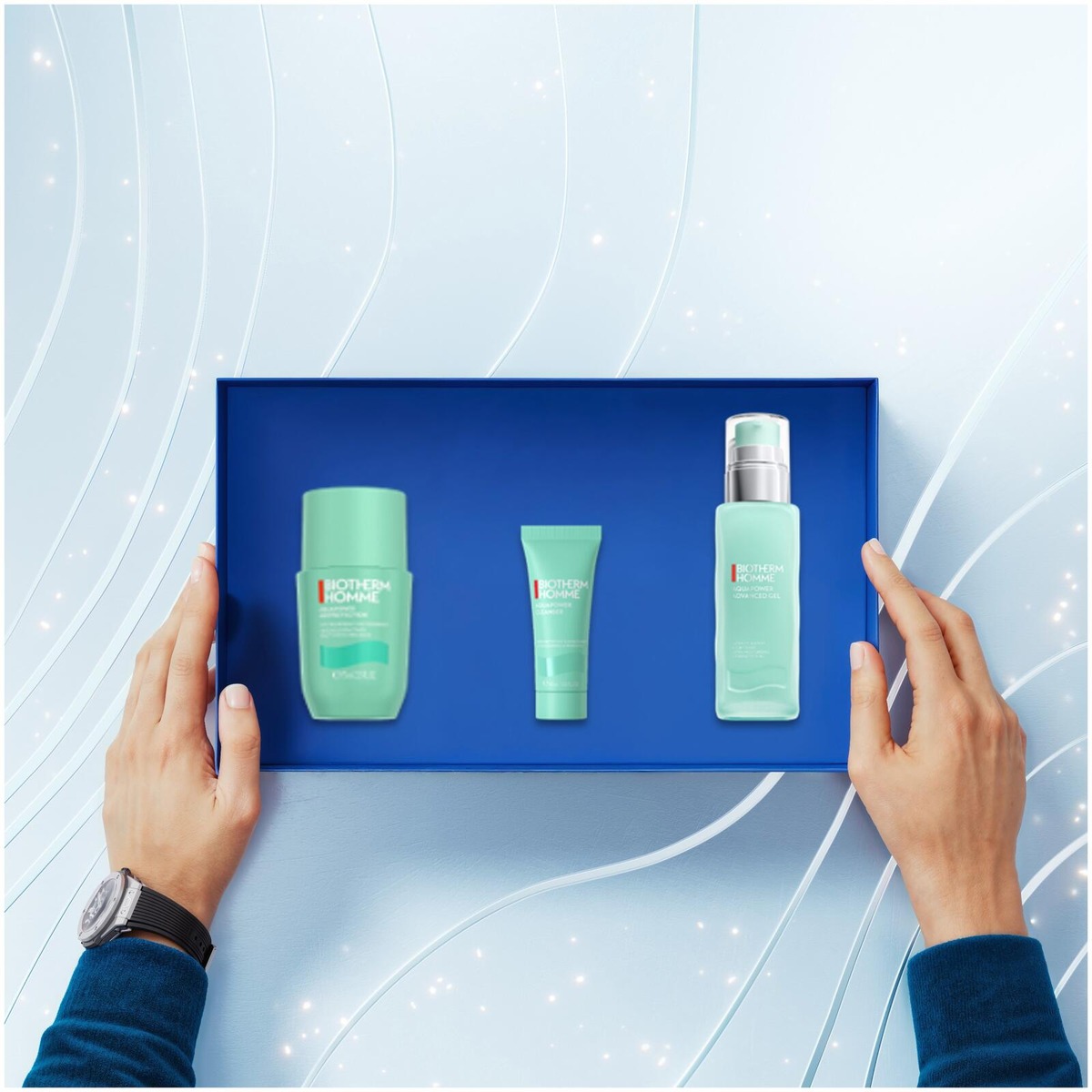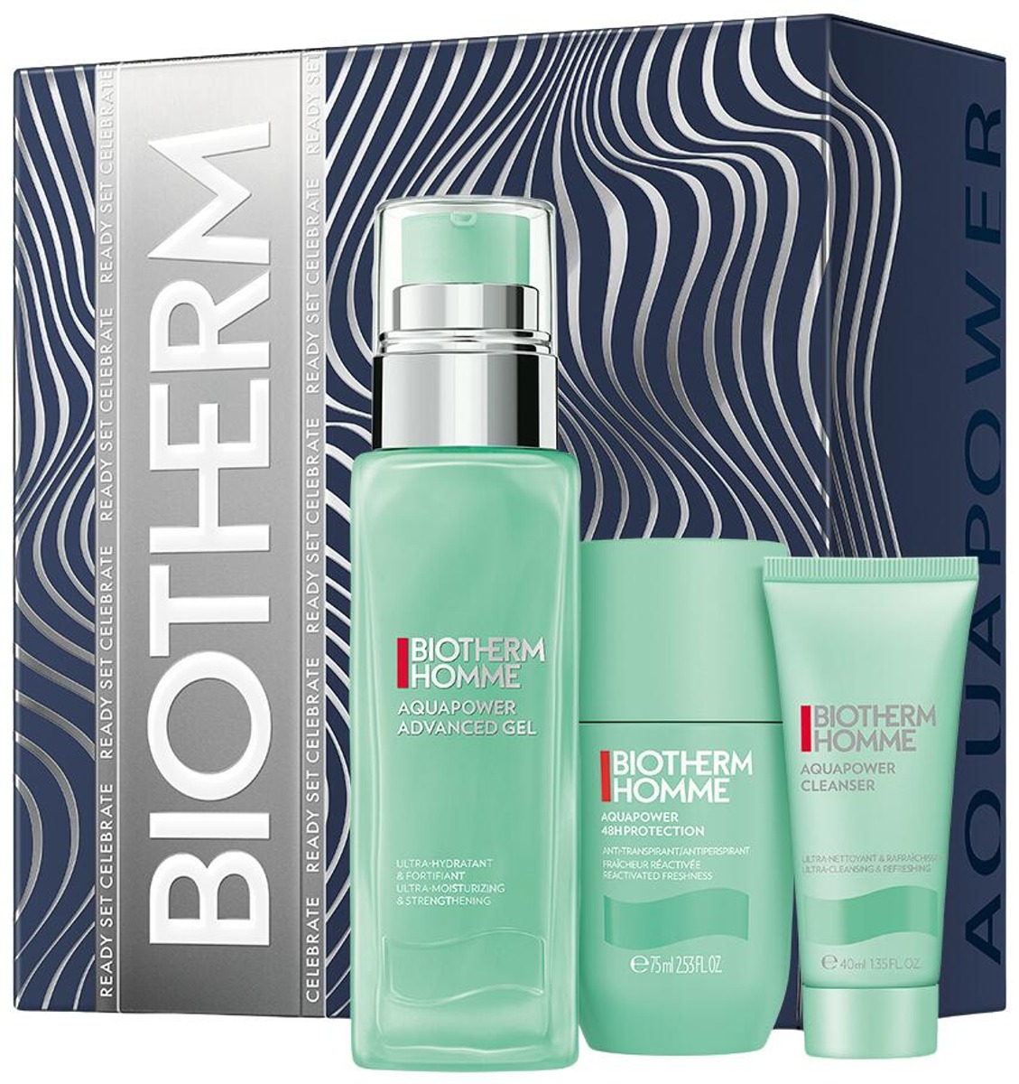 Biotherm Aquapower Men Holiday Set-ihonhoitopakkaus sisältää: Aquapower Advanced Gel 75 ml + Aquapower Oligo-Thermal Gel Cleanser 40 ml + Aquapower Ice Cooling Effect Antiperspirant 75 ml. Biotherm Homme Aquapower Advanced Gel PNM 75 ml on kosteuttava päivävoide miehille. Sopii kaikille ihotyypeille. Sisältää Biothermin patentoitua Life Planktonia, joka tunnetaan rauhoittavista ominaisuuksistaan ja on peräisin Ranskan kuumista lähteistä. Aquapower on erityisesti miehille suunniteltu kosteuttava tuote, joka antaa iholle välittömän virkistävän ja pehmentävän vaikutuksen. Tuloksena on poikkeuksellisen raikas tunne. Iho on runsaasti kosteutettu. Biotherm Homme Aquapower Cleanser 40 ml on kosteuttava kasvojenpuhdistustuote miehille. Puhdistaa ihon tehokkaasti jättäen kasvot pehmeäksi ja valmiiksi myöhempää parranajoa/voiteen levitystä varten. Voidaan käyttää päivittäin. Biotherm Aquapower Ice Cooling Effect Antiperspirant 75 ml on raikas ja pitkäkestoinen antiperspirantti miehille.