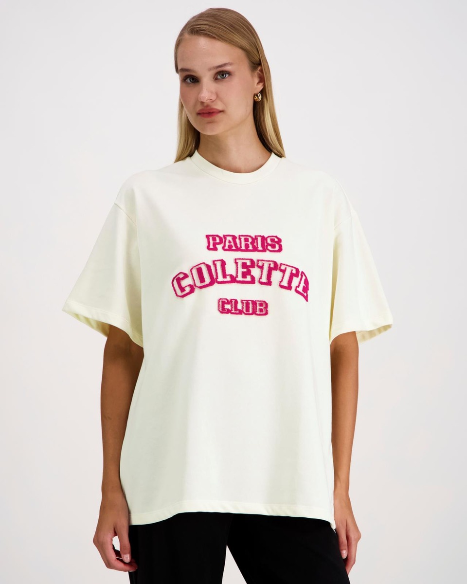 Lyhythihainen collegepusero, jossa on edessä tekstipainatus.
