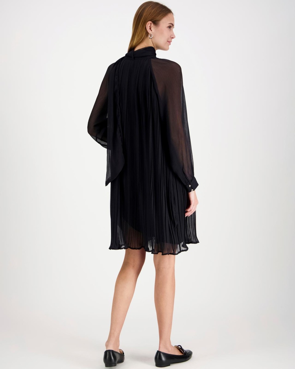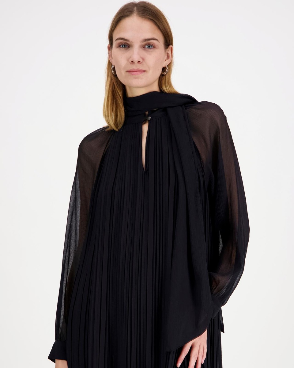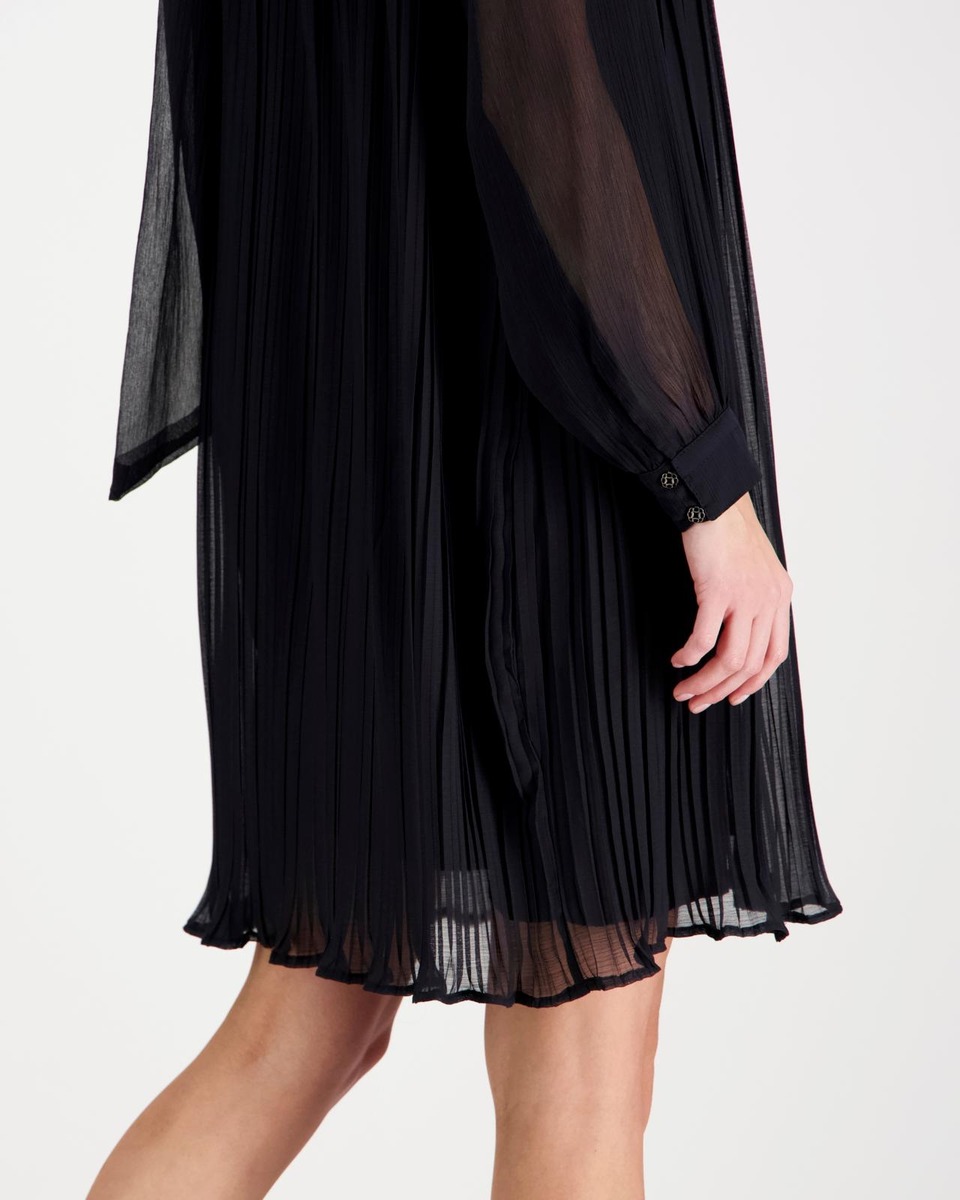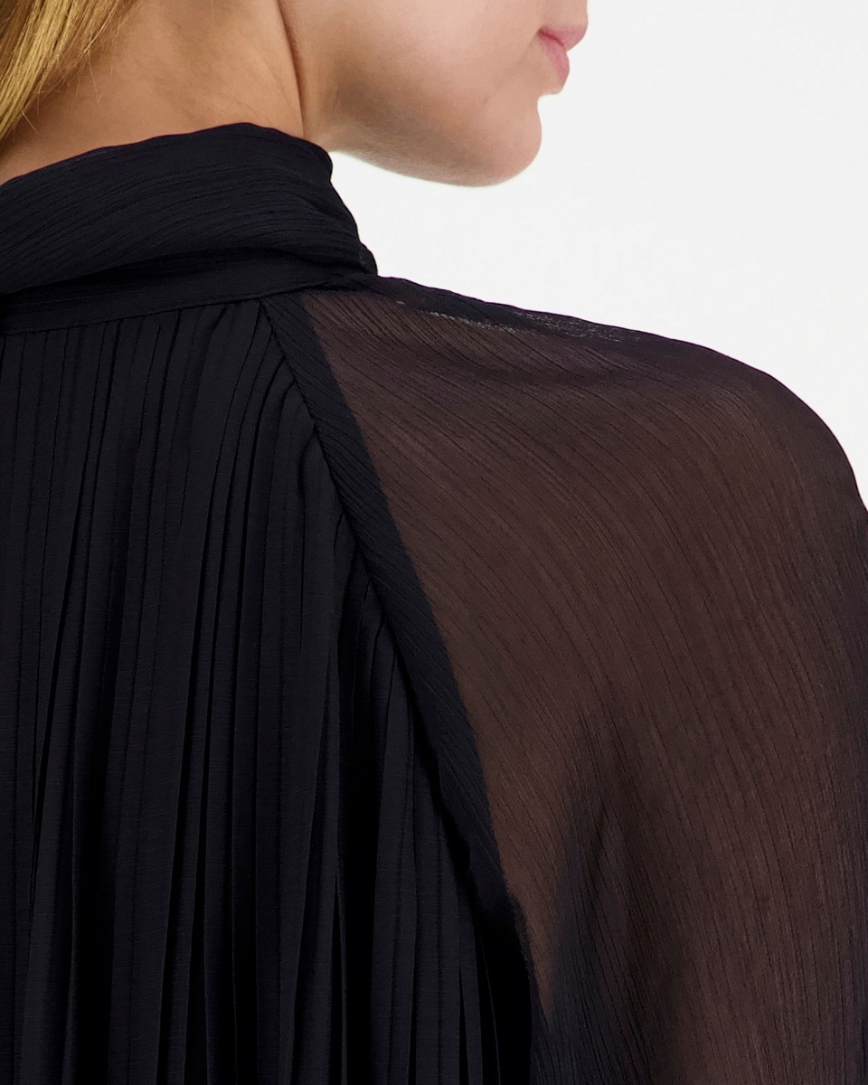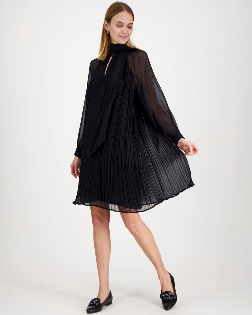 Tämän mekon läpikuultavat hihat, vyötäröä korostava nauha ja liehuva leikkaus tekevät siitä täydellisen tanssilattialle.