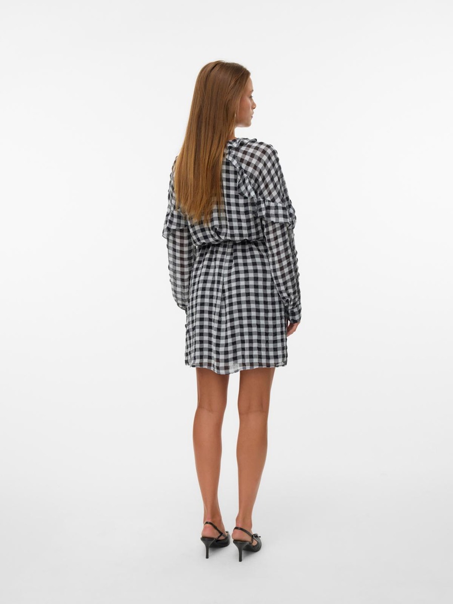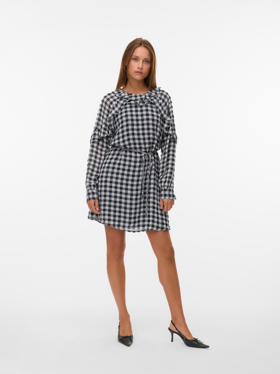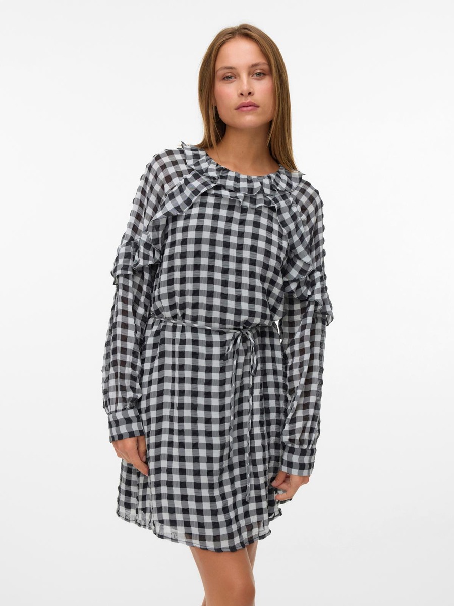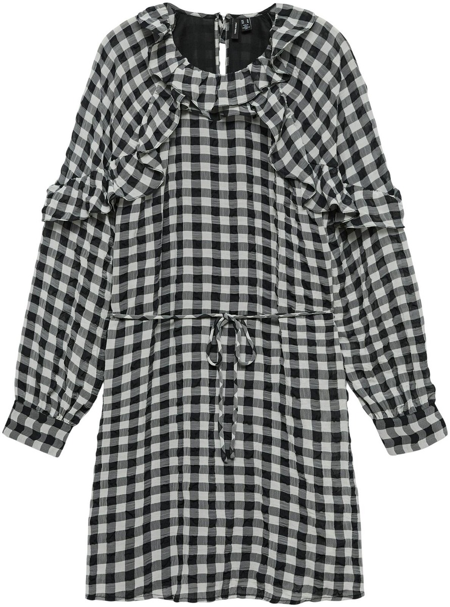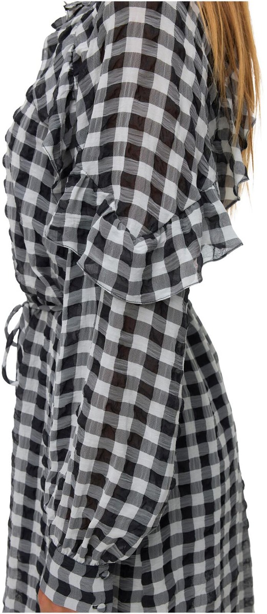 Näyttävä frillakoristeinen mekko solmittavalla vyöllä.
