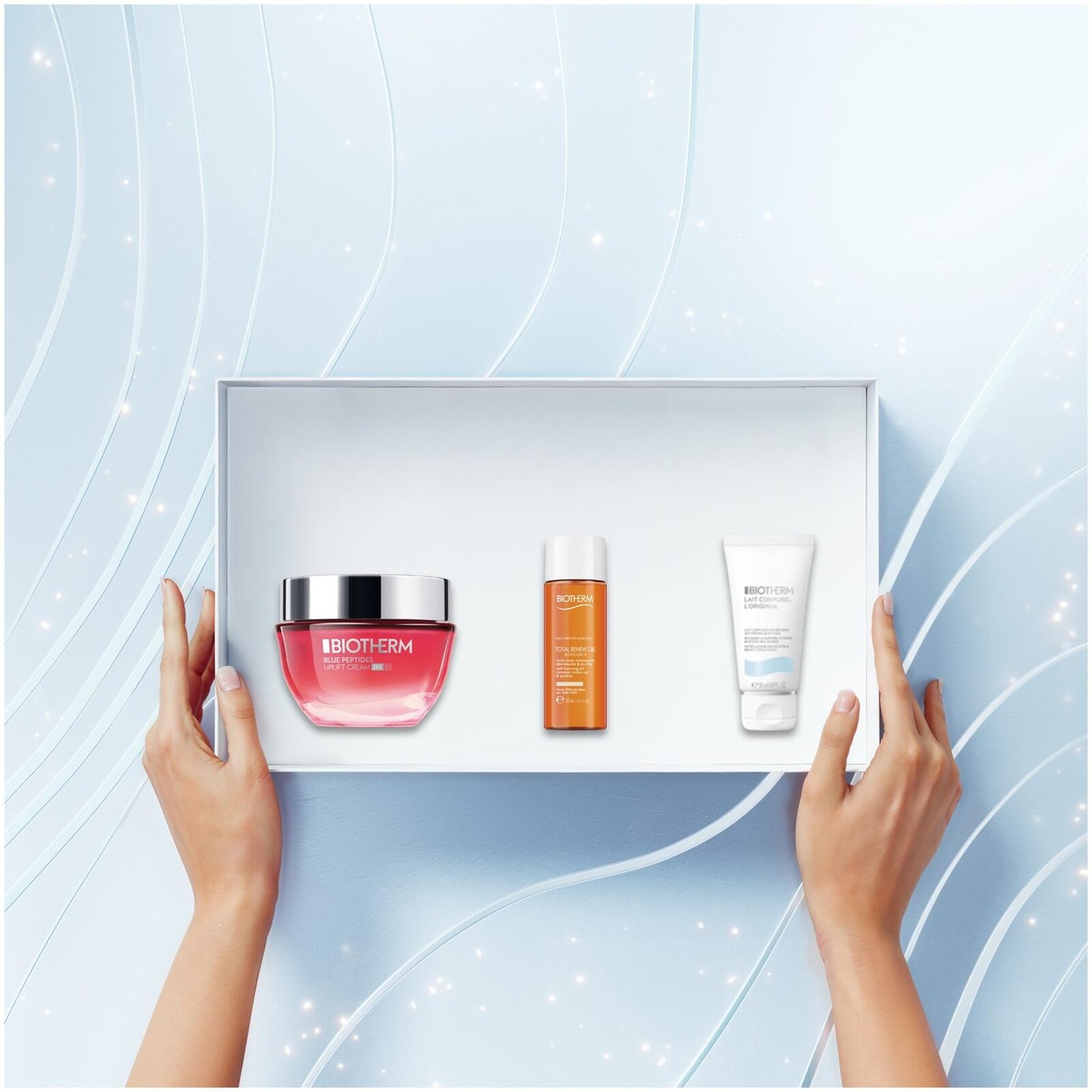 Blue Peptides Uplift SPF30 Holiday Set -sarjan on täydellinen ihonhoitorutiini, jossa on sekä yö- että päivävoide. Puhdista ensin Total Renew Oil Cleanser -puhdistusaineella kauniin ja huolitellun ihon saamiseksi.. Viimeistele kosteuttamalla Aquasource Hyalu Plump Gel -geelillä. Pakkaukseen kuuluu myös Lait Corporel Body Lotion, jota käytetään vartalolle suihkun jälkeen.