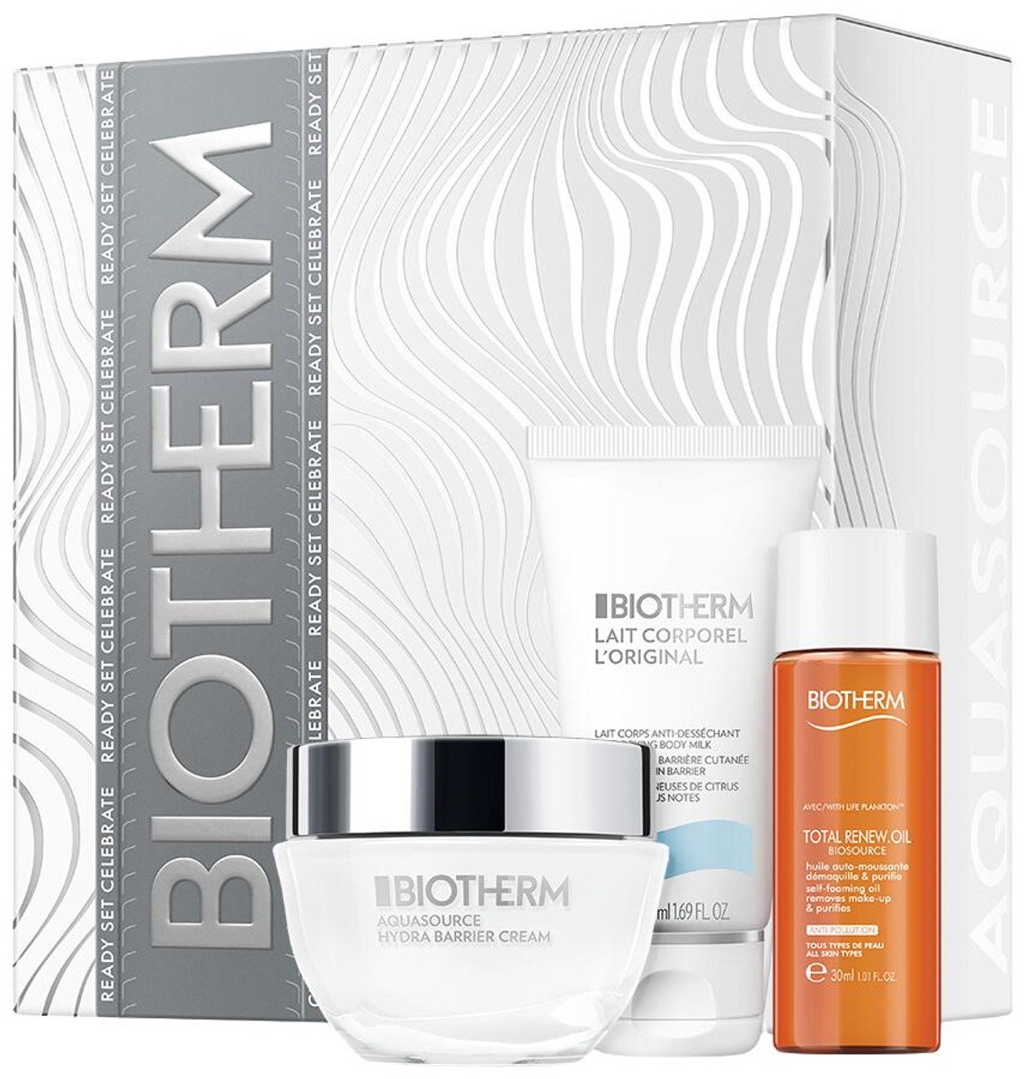 Aquasource Hydra Brarrier Holiday Set -sarjaa on täydellinen ihonhoitorutiini. Puhdista ensin Total Renew Oil Cleanser -puhdistusaineella kauniin ja huolitellun ihon saamiseksi.. Viimeistele kosteuttamalla Aquasource Hydra Barrier Moisturizing Cream -geelillä. Pakkaukseen kuuluu myös Lait Corporel Body Lotion, jota käytetään vartalolle suihkun jälkeen.