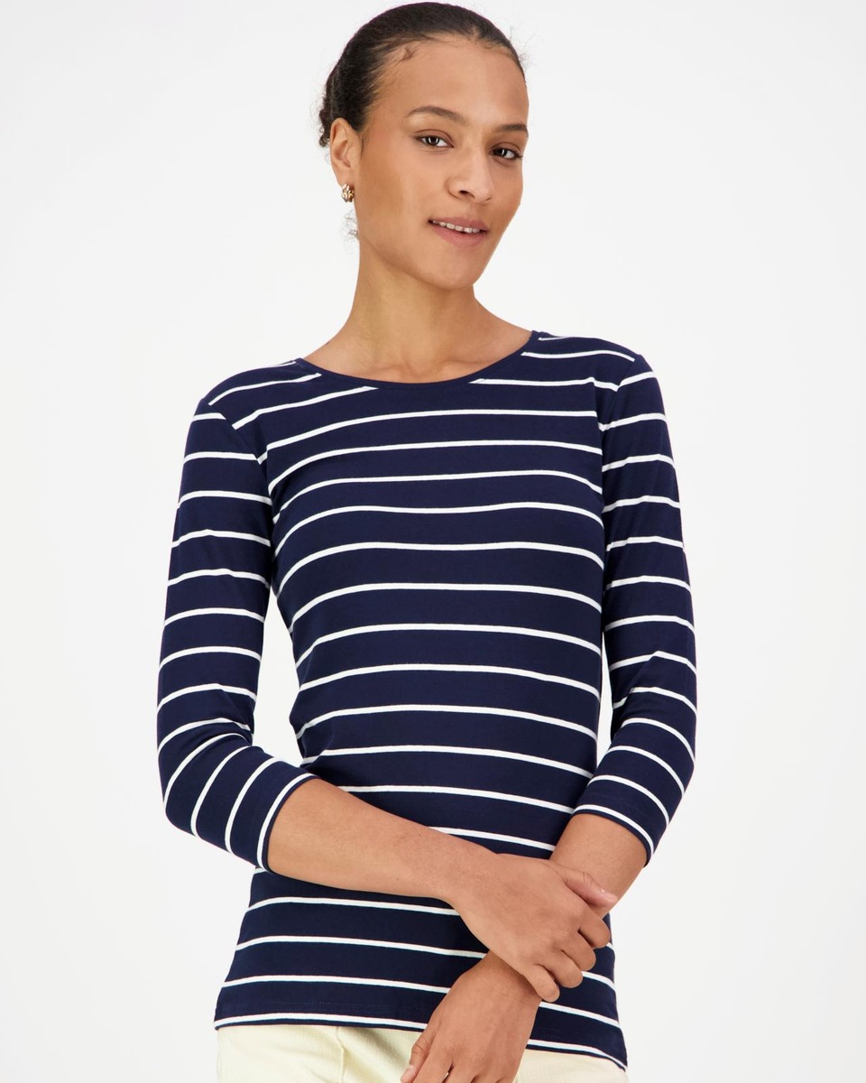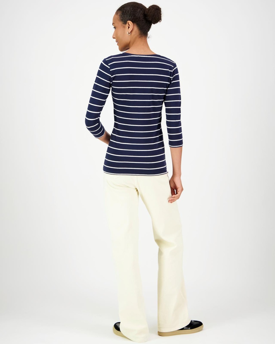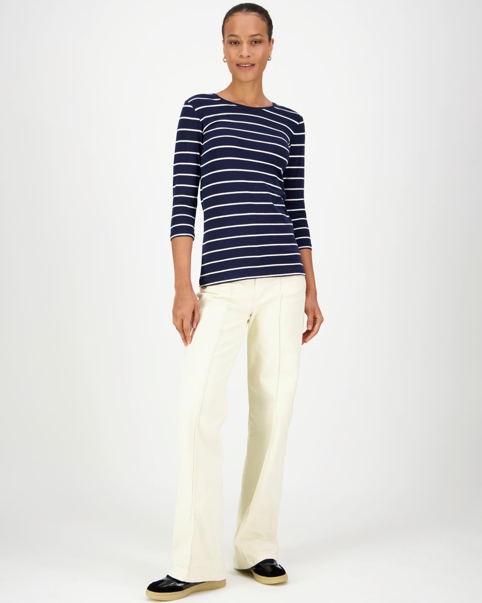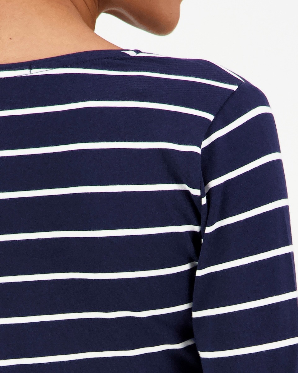 Aventuran raidallinen trikoopaita pyöreällä pääntiellä ja 3/4 pituisilla hihoilla on valmistettu pehmeästä ja hengittävästä puuvillasta ja joustavasta elastaanista. Ajaton trikoopaita, joka auttaa yhdistämään erilaisia asukokonaisuuksia.
