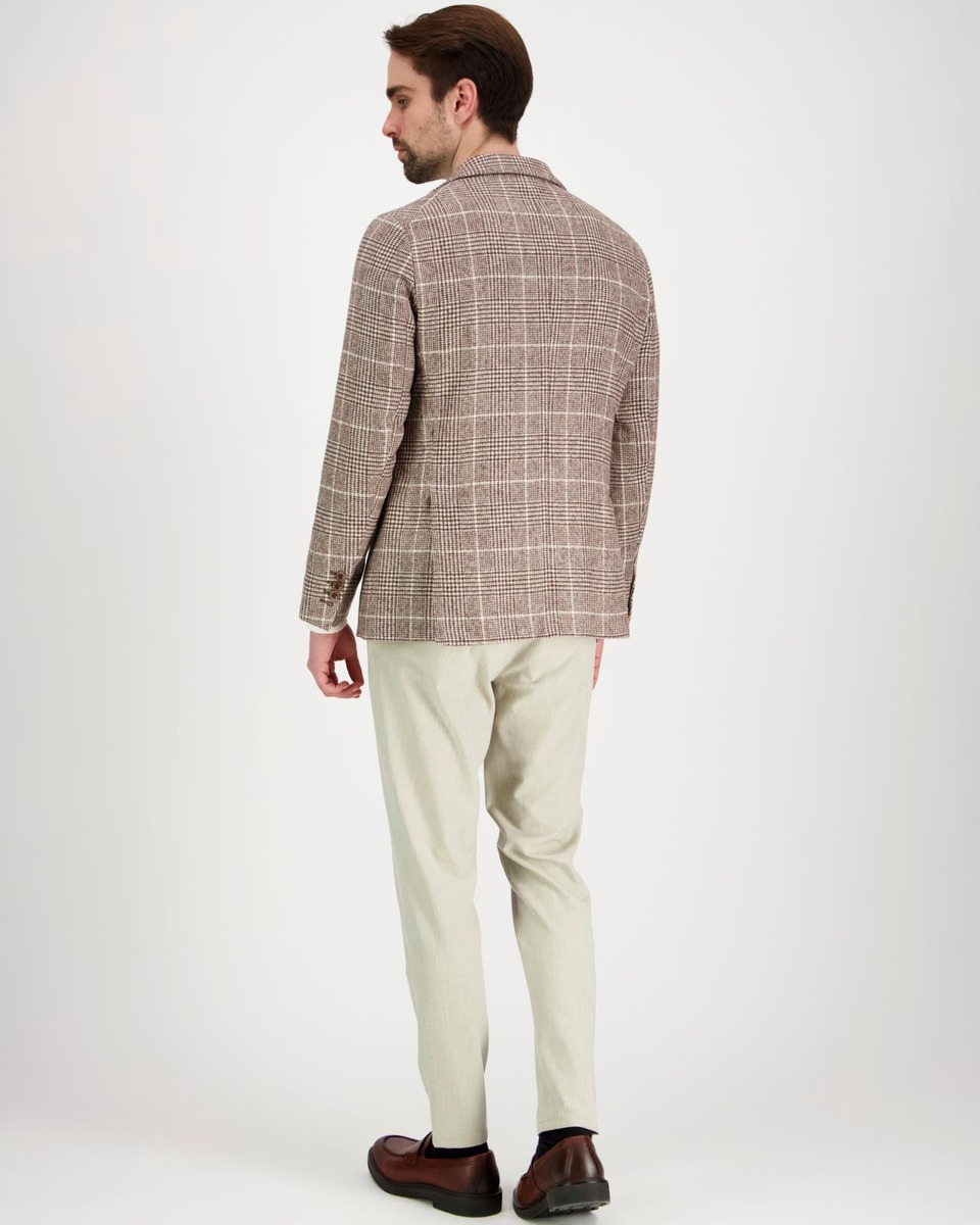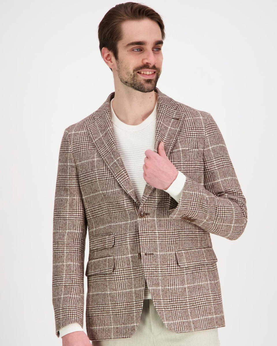 Vaaleanruskea, ruudullinen irtotakki äärimmäisen laadukkaasta italialaisesta kankaasta. Arvostettu kangaskutomo Ferla tunnetaan ylellisistä alpakanvillaa käyttävistä kankaistaan ja tämä takki on siitä täydellinen esimerkki. Lampaan- ja alpakanvillaa yhdistävä kangas on pehmeä, hengittävä, edustava ja perinteisellä Glencheck-ruutukuviolla höystetty takki on mestariteos.