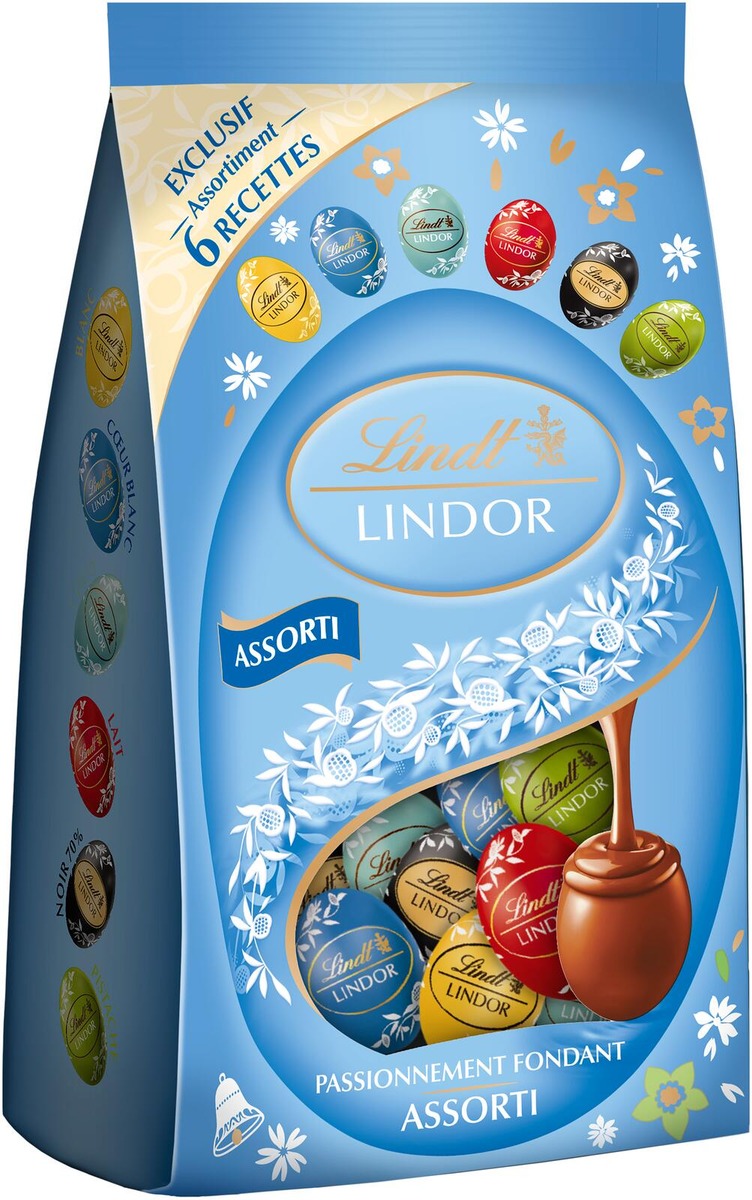 Löydä pääsiäisen taikaa tästä LINDOR-munapussista! Lajitelma sisältää pieniä täytesuklaamunia 6 eri maussa 350 gramman pussissa, joka sopii erinomaisesti jaettavaksi ystävien ja perheen kanssa. Ainutlaatuiseen lajitelmaan kuuluvat vastustamattomat maut: LINDOR maitosuklaa, 70% tumma suklaa, valkosuklaa, kookos, pistaasi ja maitosuklaa valkoisella täytteellä. Monipuolisesta lajitelmasta löytyvät suosikkimaut koko perheelle.