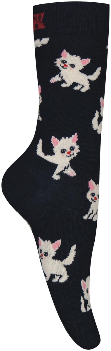 Tummansiniset kissanpentusukat leikkisällä, toistuvalla valkoisten kissanpentujen kuviolla. Lisää ripaus leikkisyyttä asuusi näillä söpöillä kissasukilla!