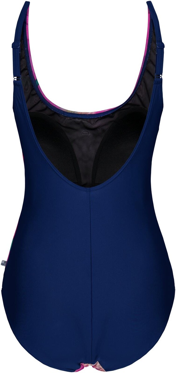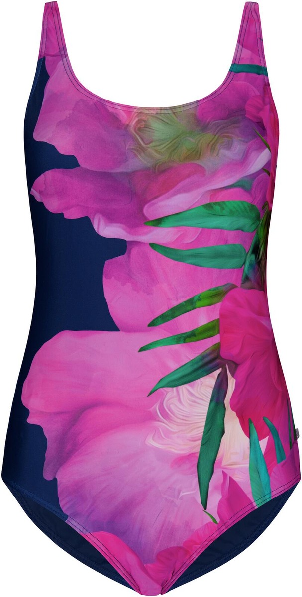 Actuelle perusmallinen uimapuku. Upea värikäs kukkaköynnös koristaa uimapuvun yläosaa, takaosa sininen. Muotoileva, vatsaa tukeva mesh-vuori etuosassa. Povelle tukea tuo ohuet ja pehmeät kiinniommellut kupit sekä leveä ja joustava kuminauha rinnan alla. Säädettävät olkaimet. Haaraosa vuoritettu. Materiaali 80 % polyamidi, 20 % elastaani. Suosittelemme noudattamaan yleisiä uima-asujen huolto- ja pesutoimenpiteitä.
