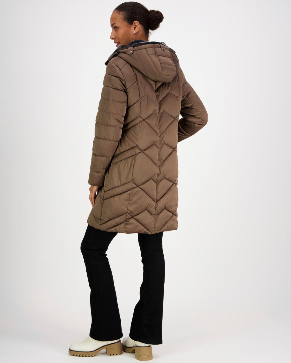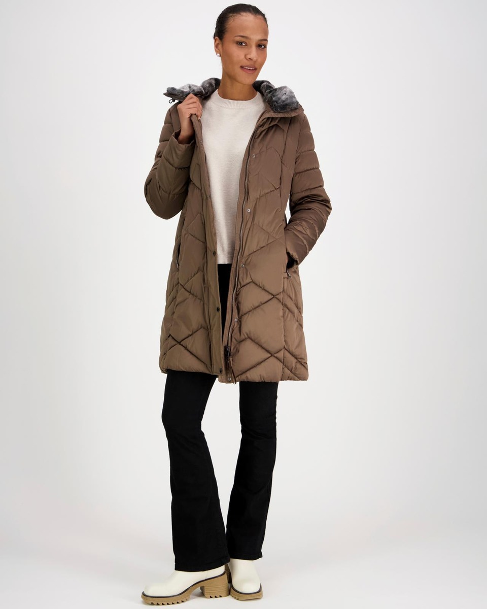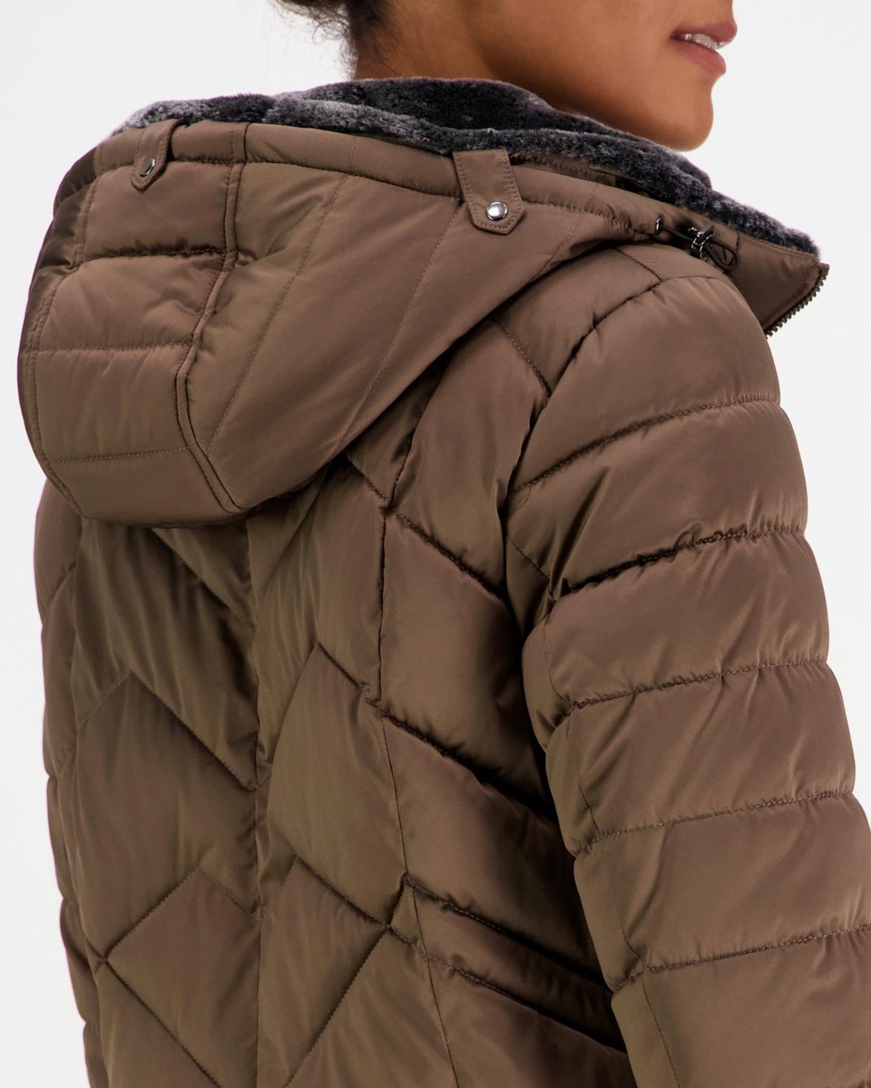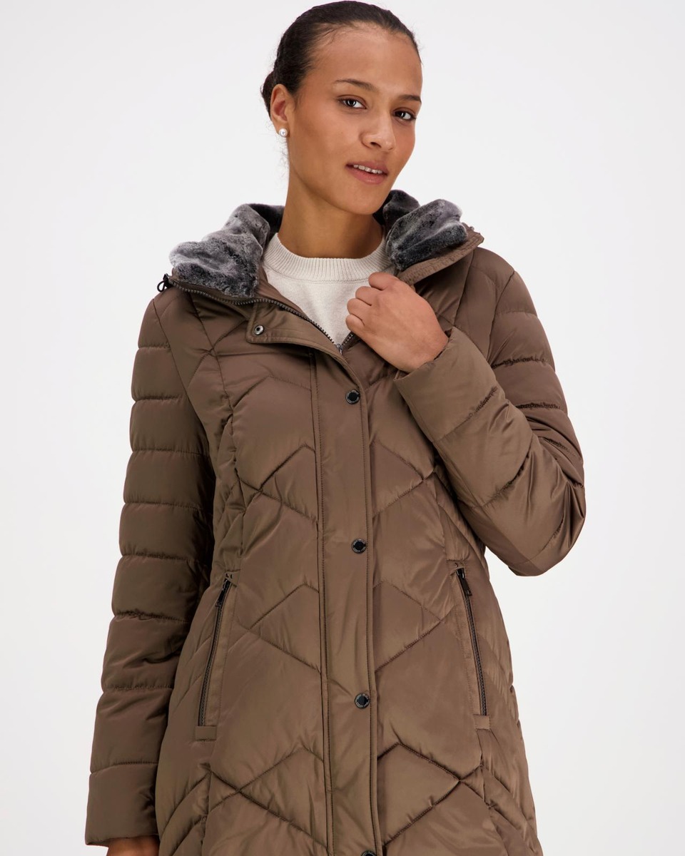 Tyylikäs ja lämmin toppatakki, joka takaa mukavuuden kylminä päivinä. Hupullinen malli tarjoaa lisäsuojaa tuulelta ja viimalta, hupun sisäpuolella ylellisen pehmeä tekoturkis. Takin takapituus 94 cm koossa 38.
