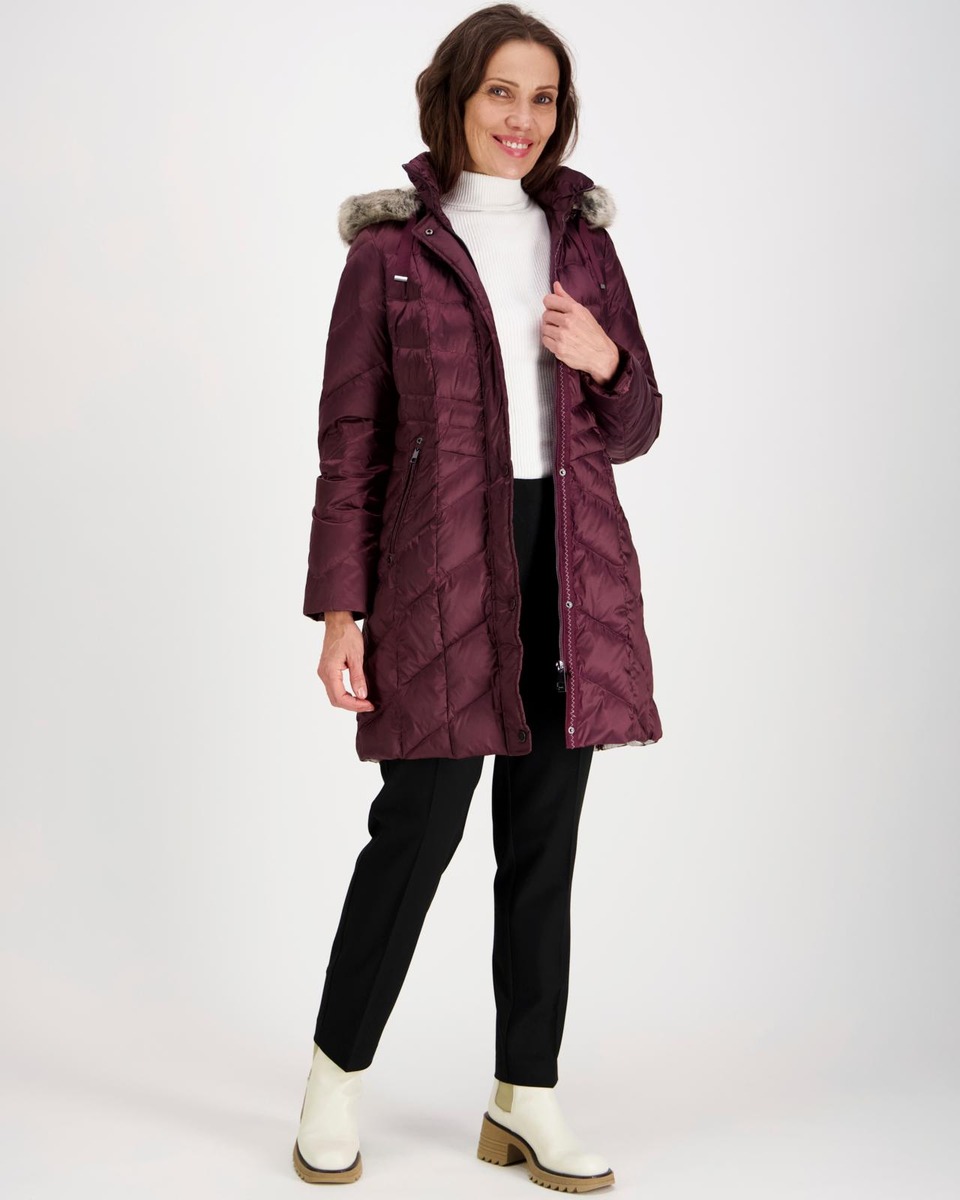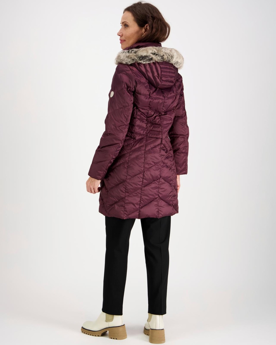 Mukavan lämmin ja tyylikäs untuvatakki, joka pitää sinut lämpimänä kylminä päivinä. Takissa on huppu ja ylellinen tekoturkis, joka lisää tyylikkyyttä. Takin takapituus 90 cm koossa 38.