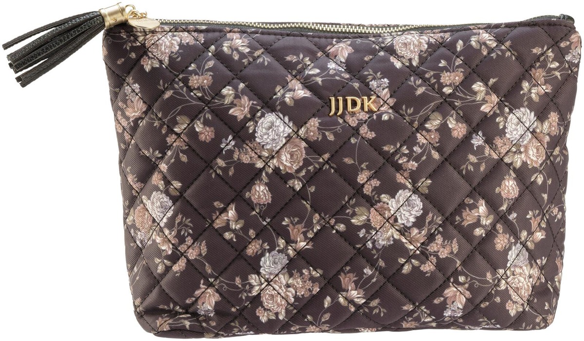 Musta kukkakuvioinen kosmetiikkalaukku neljällä sisätaskulla ja hapsuvetoketjulla. Materiaali: Polyesteri. Koko: 25x19x9cm.