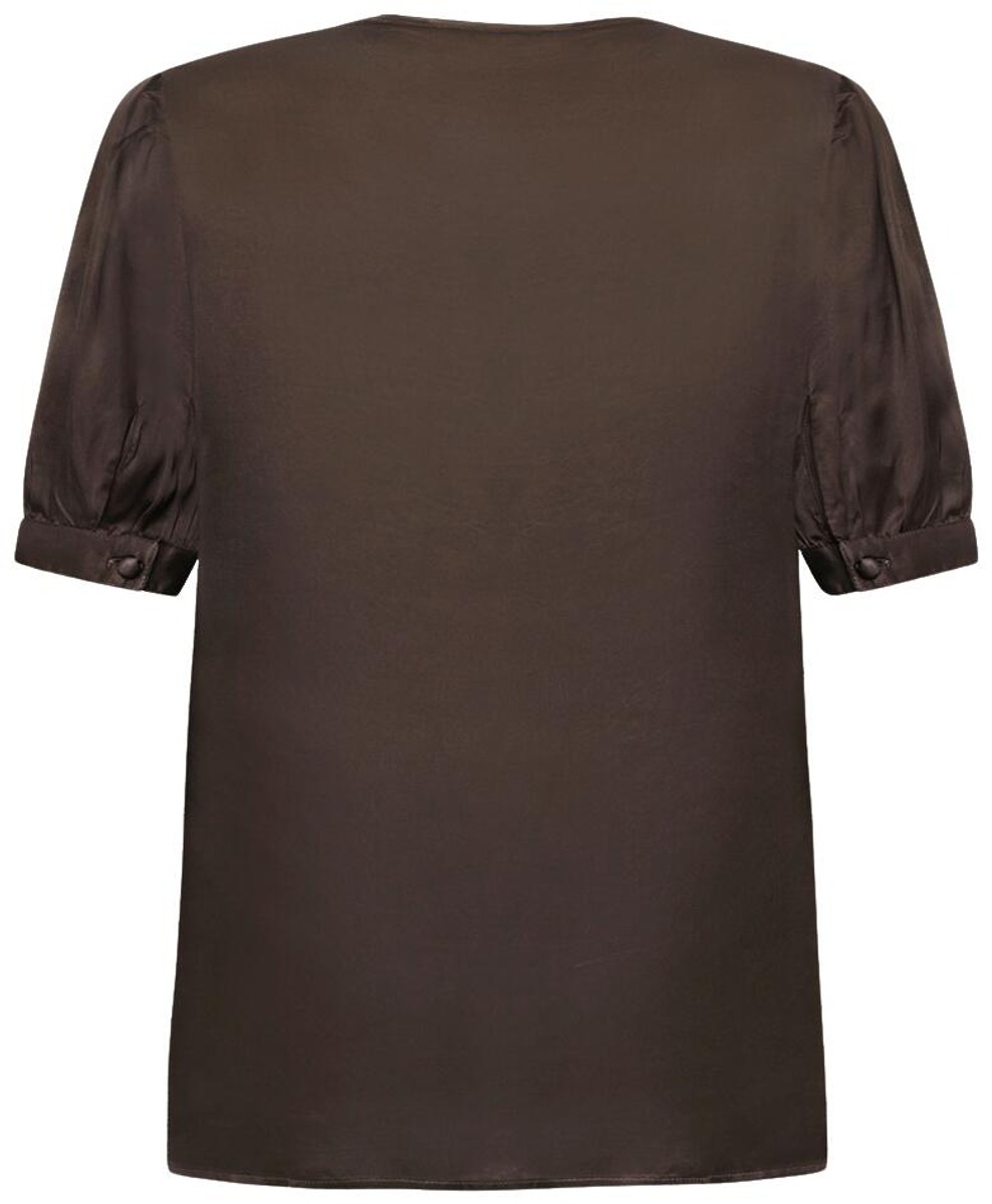 Satiiniviskoosinen, päänpäältä puettava pusero lyhyillä hihoilla ja pyöristetyllä helmalla. Puserossa on v-pääntie. Etuosalla kauniisti laskeutuva laskos.Hihansuilla takaosassa nappikiinnitys.