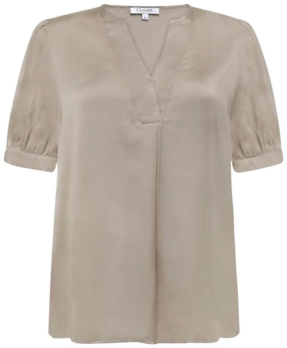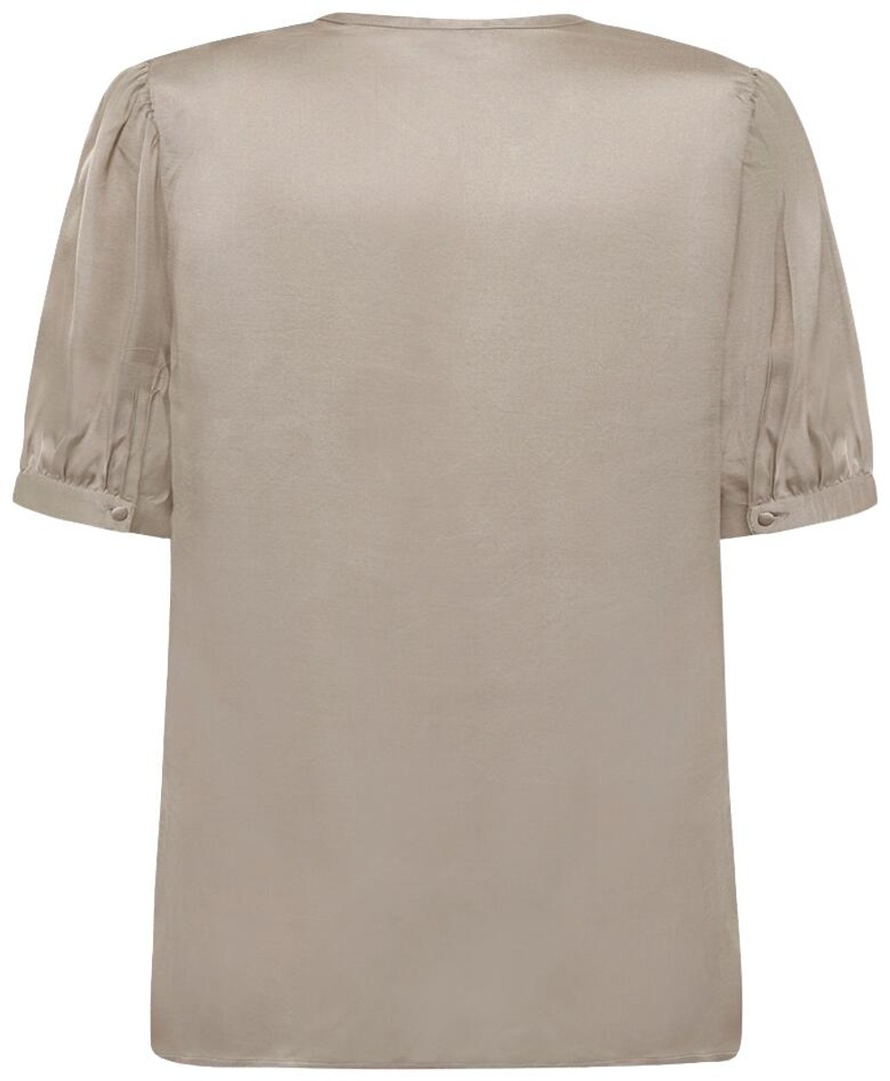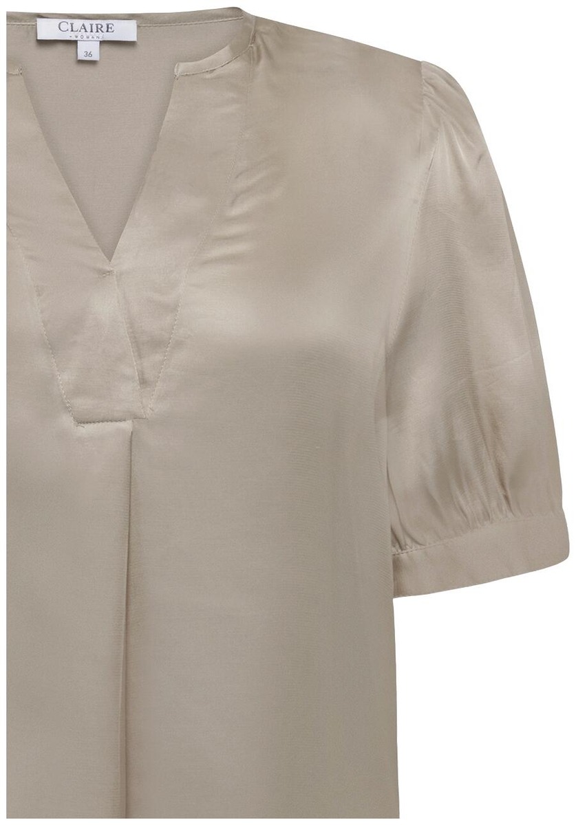 Satiiniviskoosinen, päänpäältä puettava pusero lyhyillä hihoilla ja pyöristetyllä helmalla. Puserossa on v-pääntie. Etuosalla kauniisti laskeutuva laskos.Hihansuilla takaosassa nappikiinnitys.