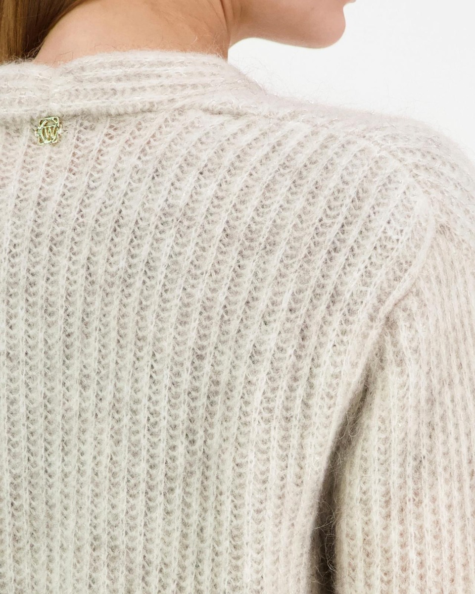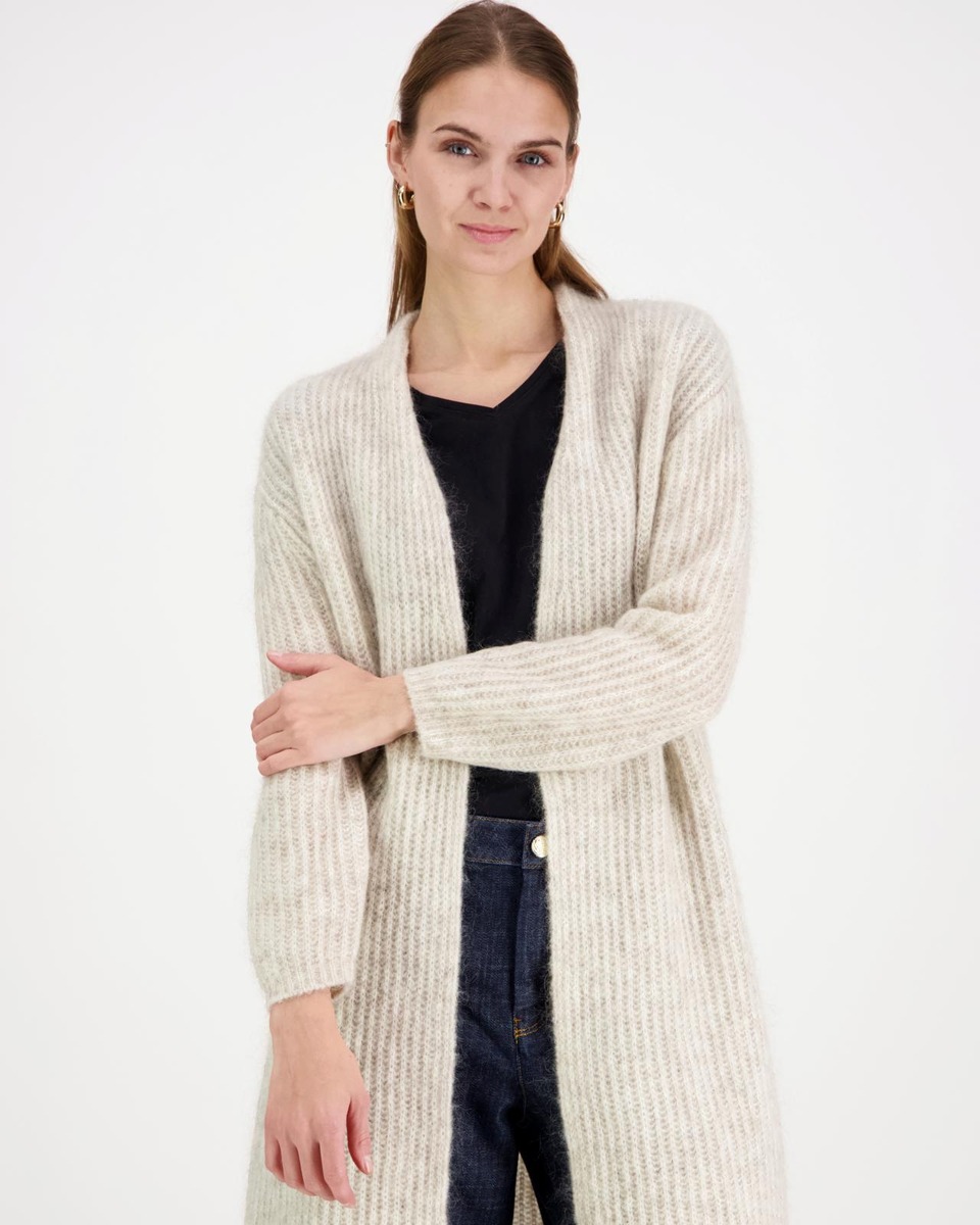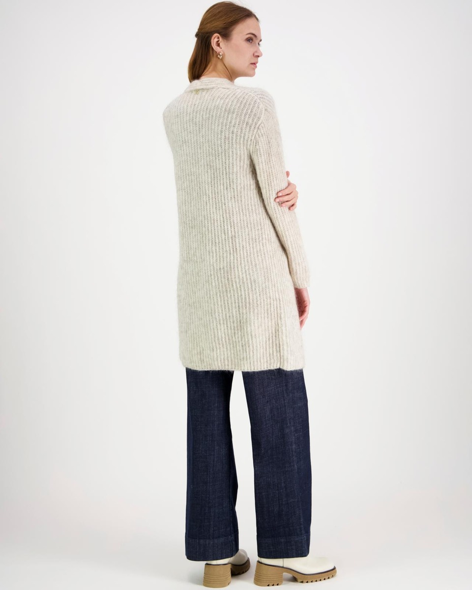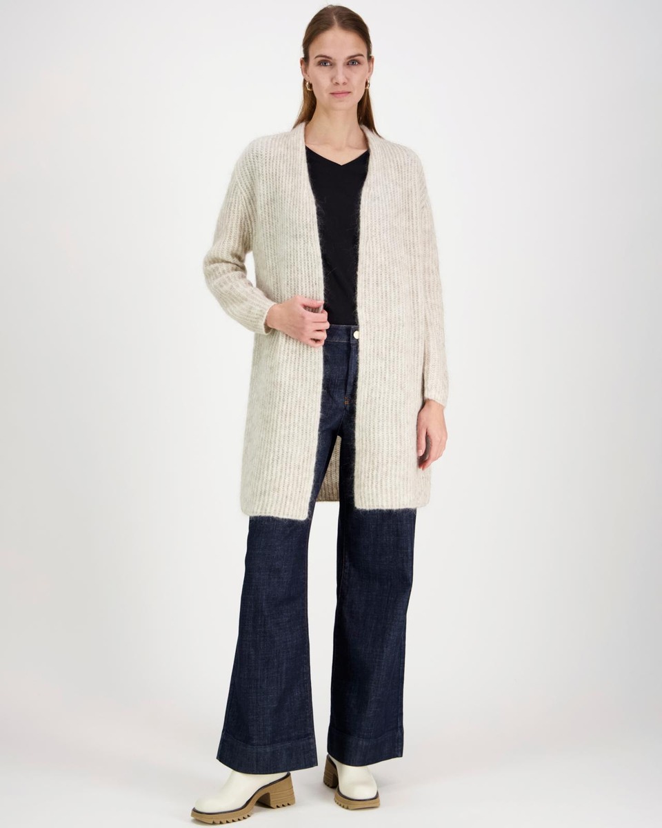 Pitkä mohairneuletakki, joka kellottuu keveästi helmalle.