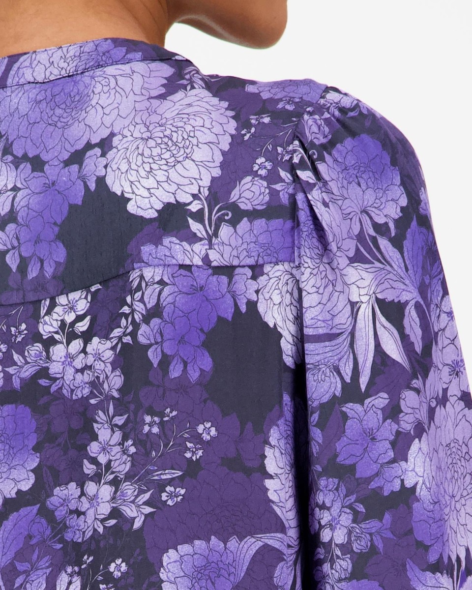 Kukkakuosillinen o-päänteinen pusero Bamberg satiiniviskoosista. Puserossa omalla päällikankaallaan päällystetyt napit . Kauniina yksityiskohtana elastiset smockrypytykset hihansuilla, joilla voit säätää hihan pituutta kauniisti.