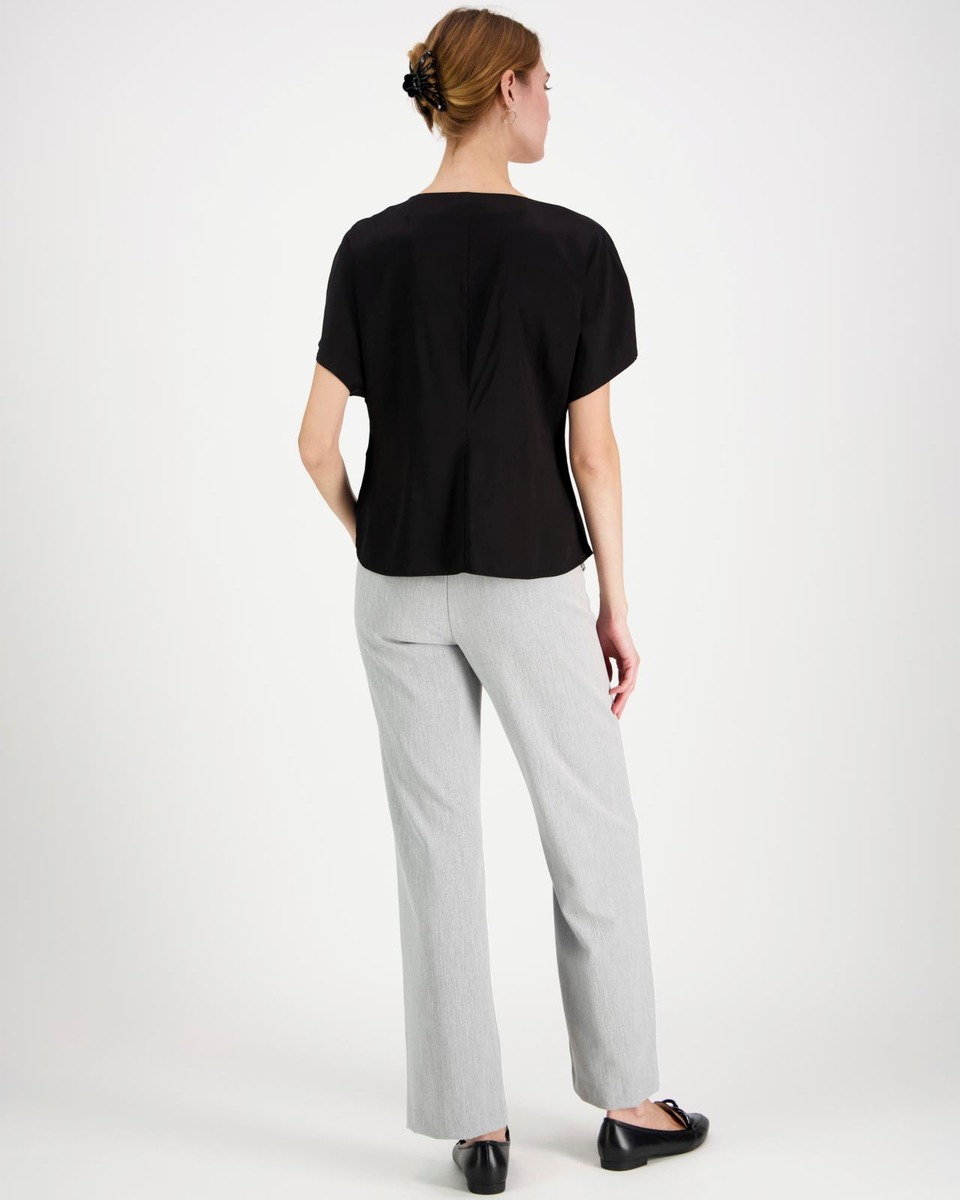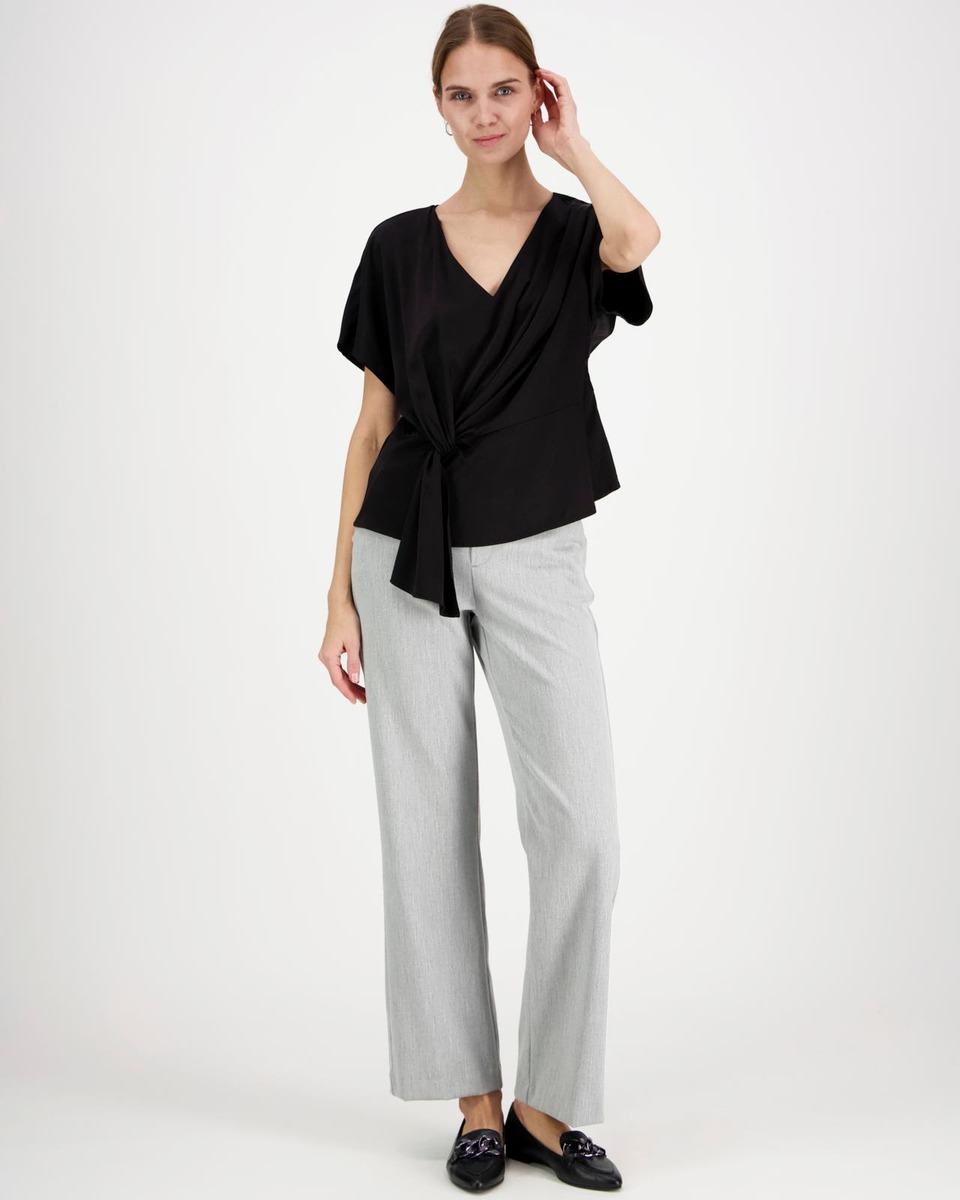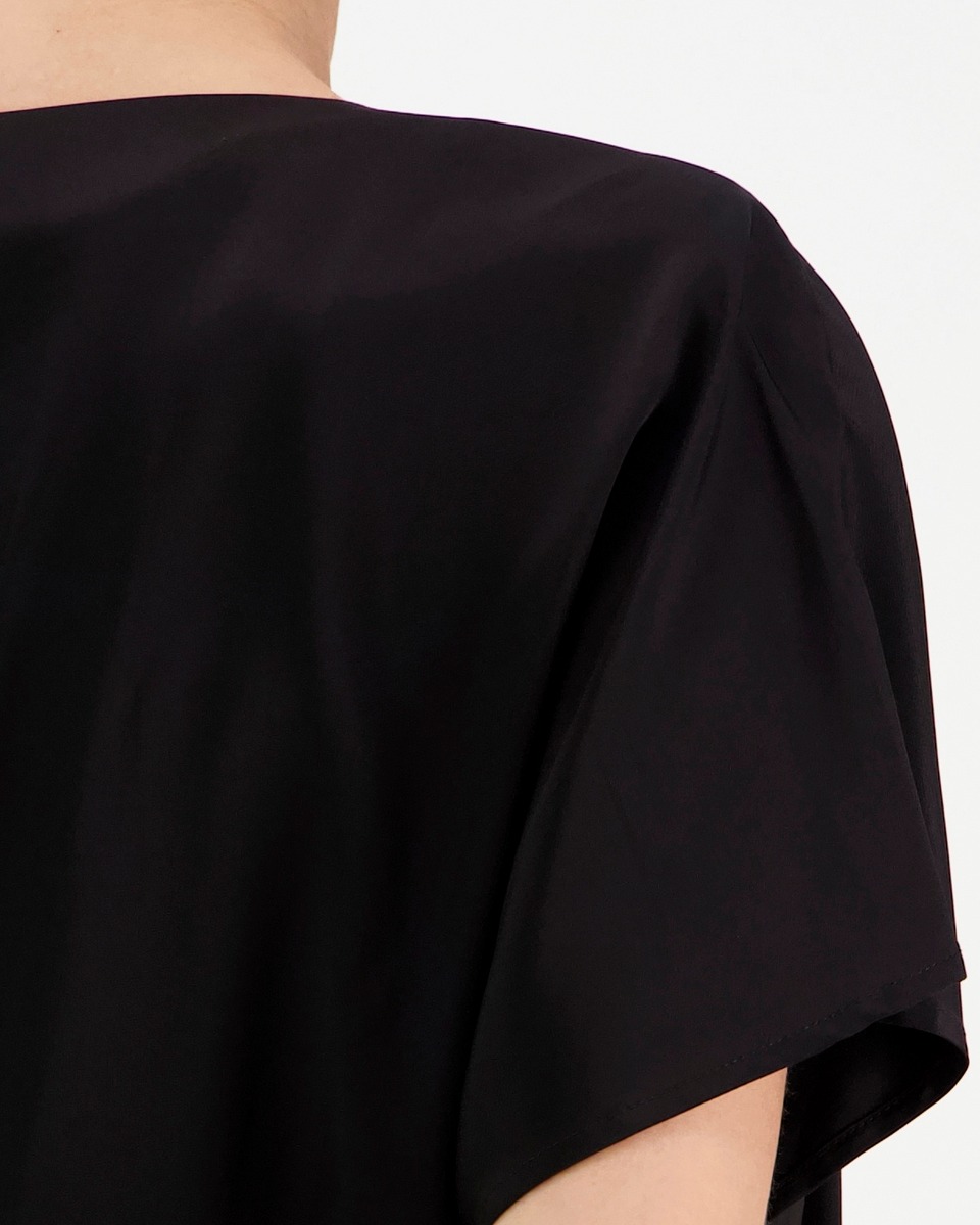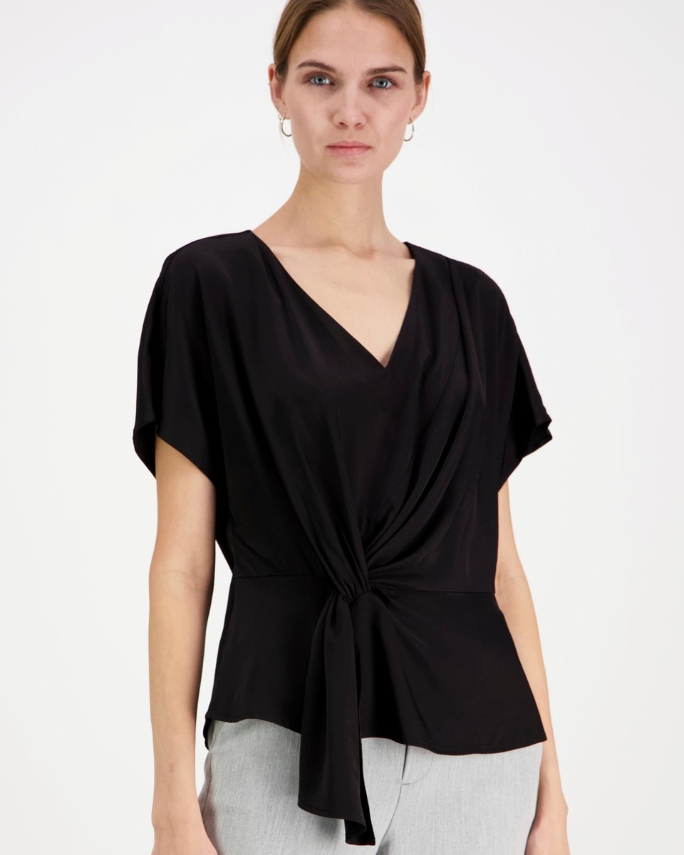 Lyhythihainen satiiniviskoosi pusero keveällä joustolla. Puserossa on v-pääntie ja kaunis solmuke edessä. Vyötäröllä muotoileva poikkileikkaus.