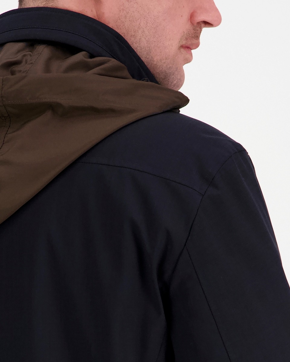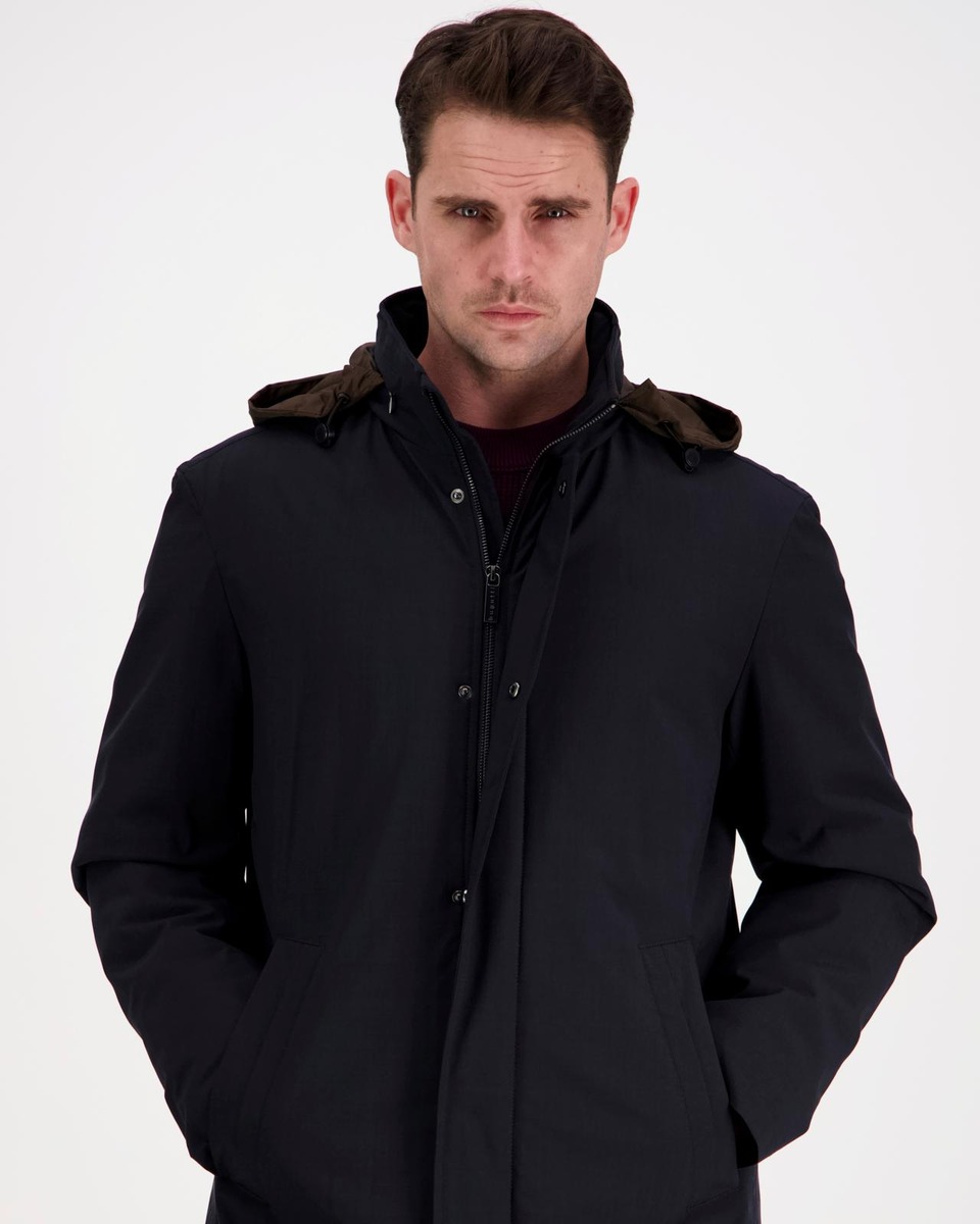 Klassinen pystykauluksinen päällystakki, jossa piilohuppu. Vetoketjulliset sivutaskut. Etureunassa vetoketjullinen ja piilopainikkeilla suljettava läppä. Selkäosassa kaarroke ja halkio. Kokovuori ja sisätaskut.