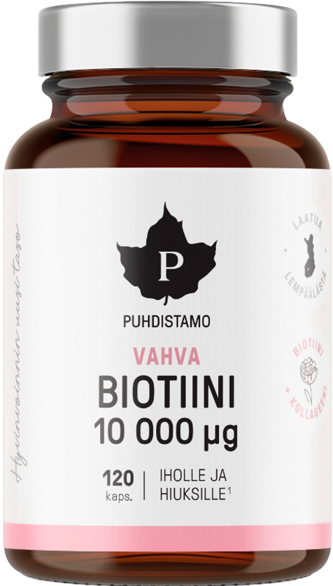 Puhdistamon Vahva Biotiini sisältää 10 000 µg biotiinia sekä hydrolysoitua 1-tyypin kollageenipeptidiä.