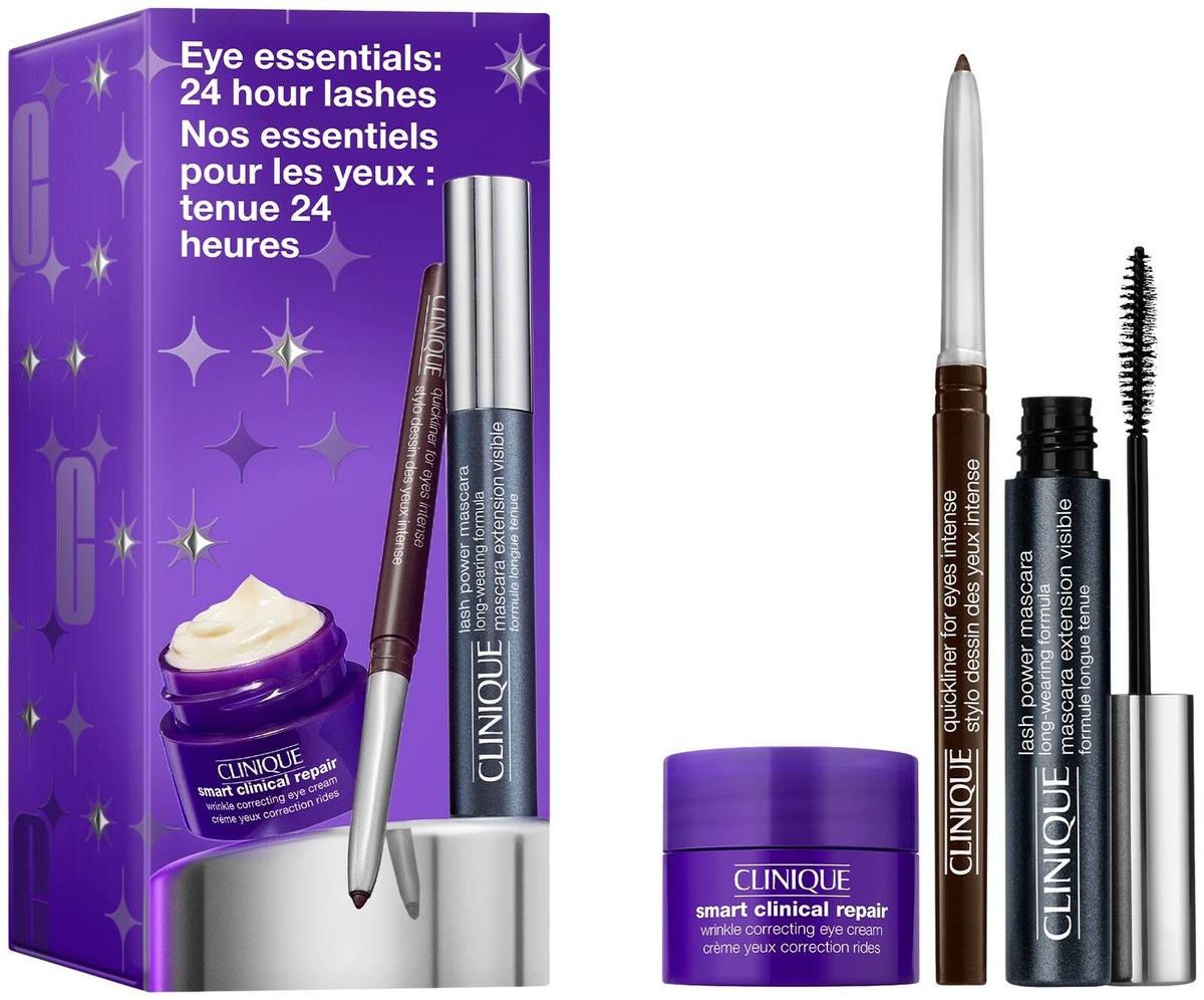 Lash Power Mascara: Water\Aqua\Eau, Acrylates Copolymer, Kaolin, Copernicia Cerifera (Carnauba) Wax\ Copernicia Cerifera Cera \Cire De Carnauba, Peg-15 Glyceryl Stearate, Silica, Butylene Glycol, Beeswax\Cera Alba\Cire D'Abeille, Alcohol, Hydrogenated Rapeseed Alcohol, Bentonite, Polyvinyl Alcohol, Sucrose Distearate, Stearic Acid, Simmondsia Chinensis (Jojoba) Seed Oil, Dimethicone, Simethicone, Vp/Va Copolymer, Nylon-66, Tocopherol, Aminomethyl Propanediol, Aminomethyl Propanol, Xanthan Gum, Chlorphenesin, Sodium Dehydroacetate, Phenoxyethanol, [+/- Iron Oxides (Ci 77491), Iron Oxides (Ci 77492), Iron Oxides (Ci 77499), Titanium Dioxide (Ci 77891), Carmine (Ci 75470), Yellow 5 Lake (Ci 19140), Blue 1 Lake (Ci 42090), Ultramarines (Ci 77007), Bismuth Oxychloride (Ci 77163), Chromium Oxide Greens (Ci 77288), Manganese Violet (Ci 77742), Chromium Hydroxide Green (Ci 77289)]||Quickliner For Eyes Intense Division: Cl (Clinique)Ingredients: Trimethylsiloxysilicate, Isododecane, Synthetic Wax, Hydrogenated Polyisobutene, Hydrogenated Polydecene, Hydrogenated Poly(C6-14 Olefin), Polybutene, Polyglyceryl-10 Pentaisostearate, Polymethylsilsesquioxane, Synthetic Fluorphlogopite, Synthetic Beeswax, Silica, Silica Silylate, Disteardimonium Hectorite, Copernicia Cerifera (Carnauba) Wax\ Copernicia Cerifera Cera \Cire De Carnauba, Propylene Carbonate, Tin Oxide, Pentaerythrityl Tetra-Di-T-Butyl Hydroxyhydrocinnamate, [+/- Mica, Titanium Dioxide (Ci 77891), Iron Oxides (Ci 77491), Iron Oxides (Ci 77492), Iron Oxides (Ci 77499), Copper Powder (Ci 77400), Manganese Violet (Ci 77742), Yellow 5 Lake (Ci 19140), Chromium Oxide Greens (Ci 77288), Chromium Hydroxide Green (Ci 77289), Carmine (Ci 75470), Bismuth Oxychloride (Ci 77163), Aluminum Powder (Ci 77000), Bronze Powder (Ci 77400), Blue 1 Lake (Ci 42090), Ferric Ammonium Ferrocyanide (Ci 77510), Ferric Ferrocyanide (Ci 77510), Ultramarines (Ci 77007)]||Clinique Smart Clinical Repair™ Wrinkle Correcting Eye Cream|Water\Aqua\Eau, Tridecyl Trimellitate, Glycerin, Neopentyl Glycol Diethylhexanoate, Polyglyceryl-6 Distearate, Glyceryl Behenate, Mangifera Indica (Mango) Seed Butter, Propanediol, Butyrospermum Parkii (Shea) Butter, Cetearyl Wheat Straw Glycosides, Hypnea Musciformis (Algae) Extract, Gelidiella Acerosa Extract, Polygonum Cuspidatum Root Extract, Laminaria Digitata Extract, Saccharomyces Lysate Extract, Camellia Sinensis Leaf Extract, Sigesbeckia Orientalis (St. Paul'S Wort) Extract, Whey Protein\Lactis Protein\Protéine Du Petit-Lait, Prunus Amygdalus Dulcis (Sweet Almond) Seed Extract, Acetyl Hexapeptide-8, Acetyl Octapeptide-3, Palmitoyl Tripeptide-1, Palmitoyl Tetrapeptide-7, Palmitoyl Hexapeptide-12, Phytosteryl/Isostearyl/Cetyl/Stearyl/Behenyl Dimer Dilinoleate, Lactobacillus Ferment, Sodium Hyaluronate, Tocopheryl Acetate, Butylene Glycol, Cetearyl Alcohol, Caffeine, Tetrahexyldecyl Ascorbate, Sucrose, Acetyl Glucosamine, Dipotassium Glycyrrhizate, Arachidyl Glucoside, Jojoba Esters, Tridecyl Stearate, Dipentaerythrityl Hexacaprylate/Hexacaprate, Molasses Extract\Saccharum Officinarum\Extrait De Mélasse, Trehalose, Ethylhexylglycerin, Cholesterol, Bisabolol, Peg-8, Beeswax\Cera Alba\Cire D'Abeille, Glyceryl Acrylate/Acrylic Acid Copolymer, Glycine Soja (Soybean) Seed Extract, Caprylyl Glycol, Tocopherol, Nylon-12, Potassium Cetyl Phosphate, Glyceryl Polymethacrylate, Acrylates/C10-30 Alkyl Acrylate Crosspolymer, Ammonium Acryloyldimethyltaurate/Vp Copolymer, Arachidyl Alcohol, Cetyl Alcohol, Polyglyceryl-3 Beeswax, Behenyl Alcohol, Glyceryl Stearate, Stearic Acid, Carbomer, Polysorbate 20, Sodium Hydroxide, Bht, Disodium Edta, Sodium Citrate, Potassium Sorbate, Sodium Benzoate, Phenoxyethanol