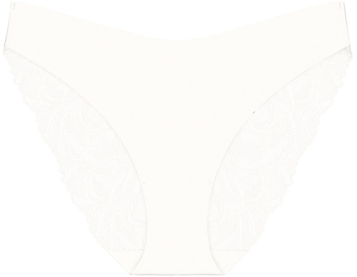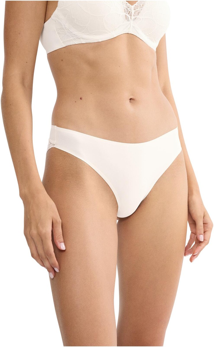Keskipeittävät high-leg tai-alushousut, jossa on saumaton liimaus ja sileä vyötäröresori, tarjoten toisen ihon kaltaisen tunteen. Alushousut on valmistettu sileästä pitsistä ja pehmeästä mikrokuidusta, jotka ovat molemmat osittain kierrätettyjä.