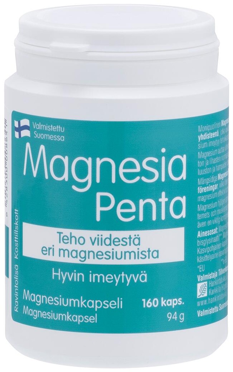Monipuolinen MAGNESIA PENTA sisältää magnesiumia viitenä eri yhdisteenä, jotka vaikuttavat suoliston eri osissa. Tämän ansiosta magnesium imeytyy tehokkaasti ja vaikuttaa elimistössä pitkään. Magnesium auttaa vähentämään väsymystä ja uupumusta, edistää hermoston ja lihasten normaalia toimintaa sekä proteiinisynteesiä. Se on myös luuston ja hampaiden tärkeä rakennusaine. Annostus: 2-4 kapselia päivässä nesteen kanssa. Ei sisällä eläinperäisiä ainesosia. Laktoositon, hiivaton, makeuttamaton, gluteeniton. Valmistettu Suomessa.