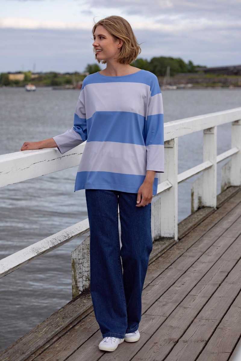 HELGA-housut on valmistettu sinisestä farkkukankaasta, jossa on hieman elastaania joustoa antamassa. Housut on tuotepesty. Vyötäröllä on kuminauha. Housut ovat suoralinjaiset ja lahkeesta väljät. Päällitikkaukset on tehty farkkutyyliin keltaisella langalla. HELGA-housut on suunniteltu Suomessa ja valmistettu Liettuassa. Malli on 177 cm pitkä ja hänellä on päällä koko 36, jonka sisäsauman pituus on 81 cm ja vyötärönympärys venyttämättä 70 cm.