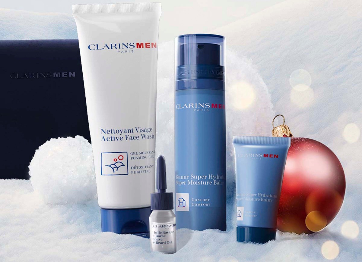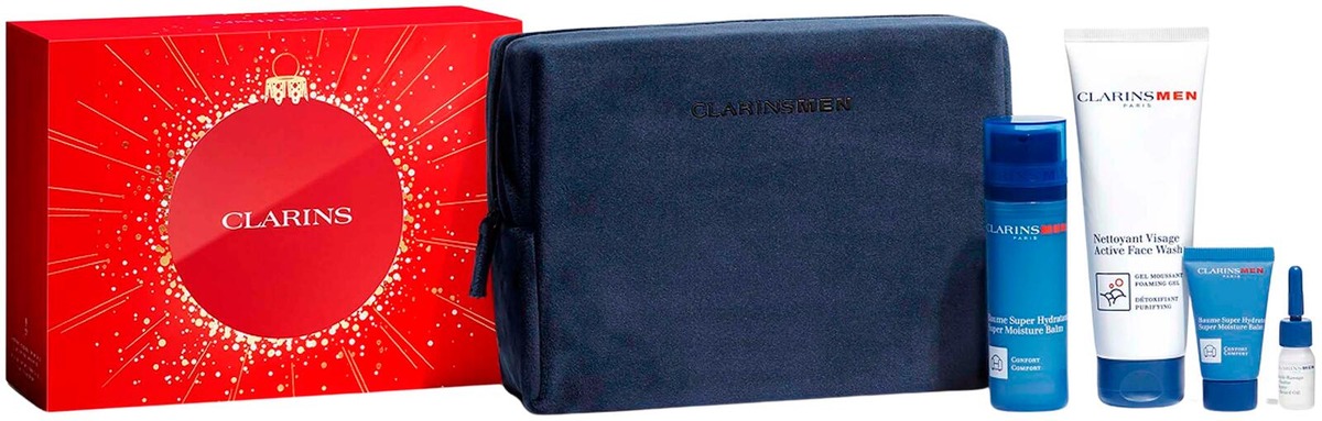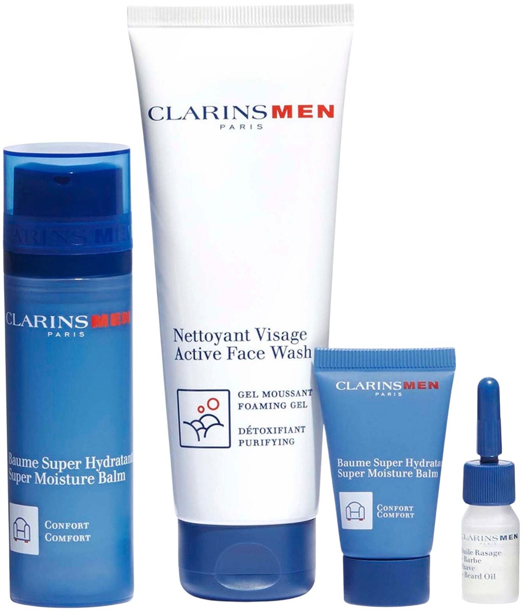 ClarinsMen Super Moisture Face Balm: AQUA/WATER/EAU. DIISOPROPYL SEBACATE. GLYCERYL STEARATE SE. GLYCERIN. ISONONYL ISONONANOATE. BUTYLENE GLYCOL. DIMETHICONE. C12-15 ALKYL BENZOATE. PARFUM/FRAGRANCE. SESAMUM INDICUM (SESAME) SEED OIL. CETYL ALCOHOL. STEARYL ALCOHOL. TALC. PROPYLENE GLYCOL. XYLITYLGLUCOSIDE. CAPRYLYL GLYCOL. POTASSIUM CETYL PHOSPHATE. ANHYDROXYLITOL. CARBOMER. ETHYLHEXYLGLYCERIN. XYLITOL. DISODIUM EDTA. SODIUM HYDROXIDE. GYMNEMA SYLVESTRE LEAF EXTRACT. GLUCOSE. KALANCHOE PINNATA LEAF EXTRACT. MARRUBIUM VULGARE EXTRACT. SEMPERVIVUM TECTORUM EXTRACT. CITRIC ACID. HIEROCHLOE ODORATA EXTRACT. PHENETHYL ALCOHOL. FURCELLARIA LUMBRICALIS EXTRACT. SODIUM BENZOATE. POTASSIUM SORBATE. LAPSANA COMMUNIS FLOWER/LEAF/STEM EXTRACT. MARIS SAL/SEA SALT/SEL MARIN. CI 42090/BLUE 1 [V3229B]. ClarinsMen Active Face Wash: AQUA/WATER/EAU. SODIUM LAURETH SULFATE. CETEARYL ALCOHOL. GLYCOL DISTEARATE. SODIUM LAUROYL SARCOSINATE. COCAMIDOPROPYL BETAINE. SODIUM COCOAMPHOACETATE. PARFUM/FRAGRANCE. DIMETHICONE. CETEARYL GLUCOSIDE. SODIUM CHLORIDE. PHENOXYISOPROPANOL. BUTYLENE GLYCOL. ACRYLATES/C10-30 ALKYL ACRYLATE CROSSPOLYMER. PROPYLENE GLYCOL. PANTHENOL. BUTYROSPERMUM PARKII (SHEA) BUTTER. COCAMIDE MIPA. CHLORPHENESIN. CITRIC ACID. SODIUM LAURATE. GLYCERIN. DISODIUM EDTA. GAULTHERIA PROCUMBENS (WINTERGREEN) LEAF EXTRACT. SODIUM CETEARYL SULFATE. SODIUM LAURYL SULFATE. HIEROCHLOE ODORATA EXTRACT. ALPINIA OFFICINARUM ROOT EXTRACT. PHENOXYETHANOL. GRINDELIA ROBUSTA EXTRACT. PORTULACA OLERACEA EXTRACT. POTASSIUM SORBATE. CI 42090/BLUE 1. CI 17200/RED 33. [C0556I]. ClarinsMen Shave Oil: CAPRYLIC/CAPRIC TRIGLYCERIDE. DICAPRYLYL ETHER. SQUALANE. SIMMONDSIA CHINENSIS (JOJOBA) SEED OIL. ARGANIA SPINOSA KERNEL OIL. RICINUS COMMUNIS (CASTOR) SEED OIL. PARFUM/FRAGRANCE. TOCOPHEROL. PISTACIA LENTISCUS (MASTIC) GUM. [V4161A]