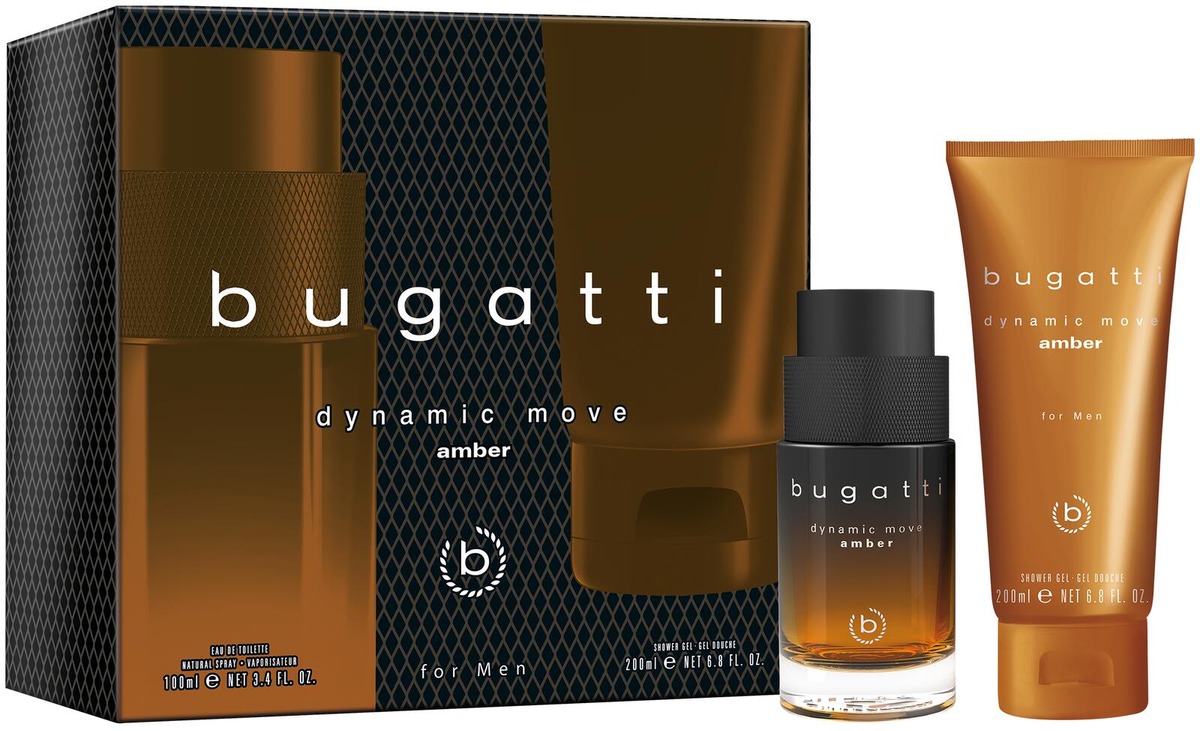 Lahjapakkaus sisältää Bugatti Dynamic Move Amber EdT 100 ml ja suihkugeelin 200 ml.