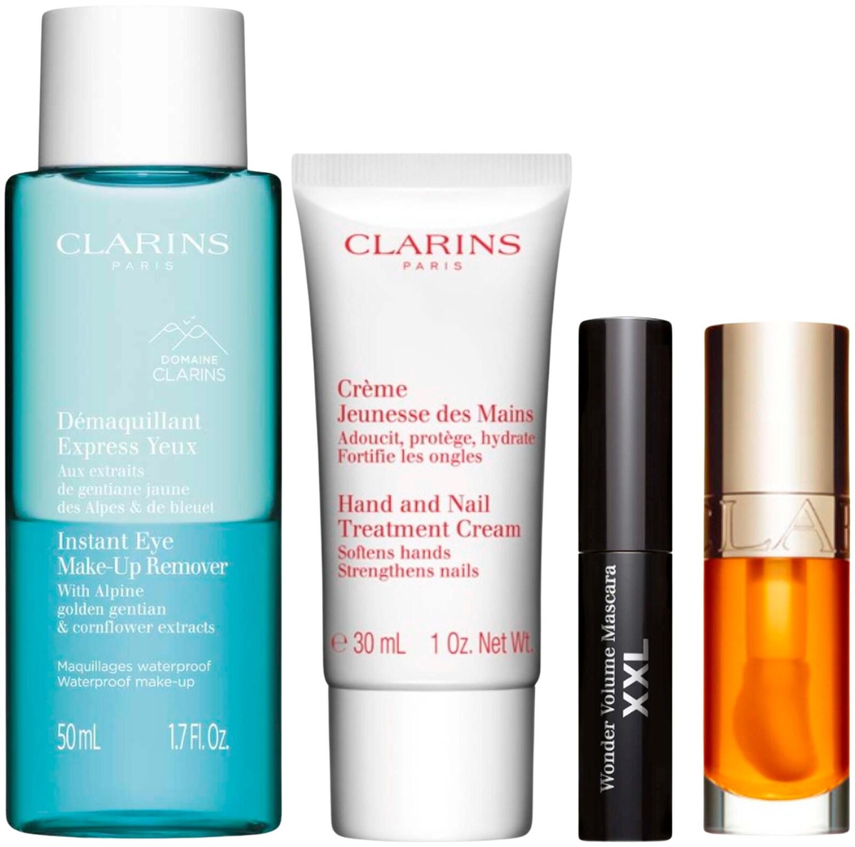 Lahjasetti sisältää: HAND AND NAIL TREATMENT CREAM TRIAL SIZE 30ML, INSTANT EYE MAKE UP REMOVER DISCOVERY SIZE 50ML, WONDER VOLUME MASCARA XXL 01 MINIATURE, LIP COMFORT OIL 01