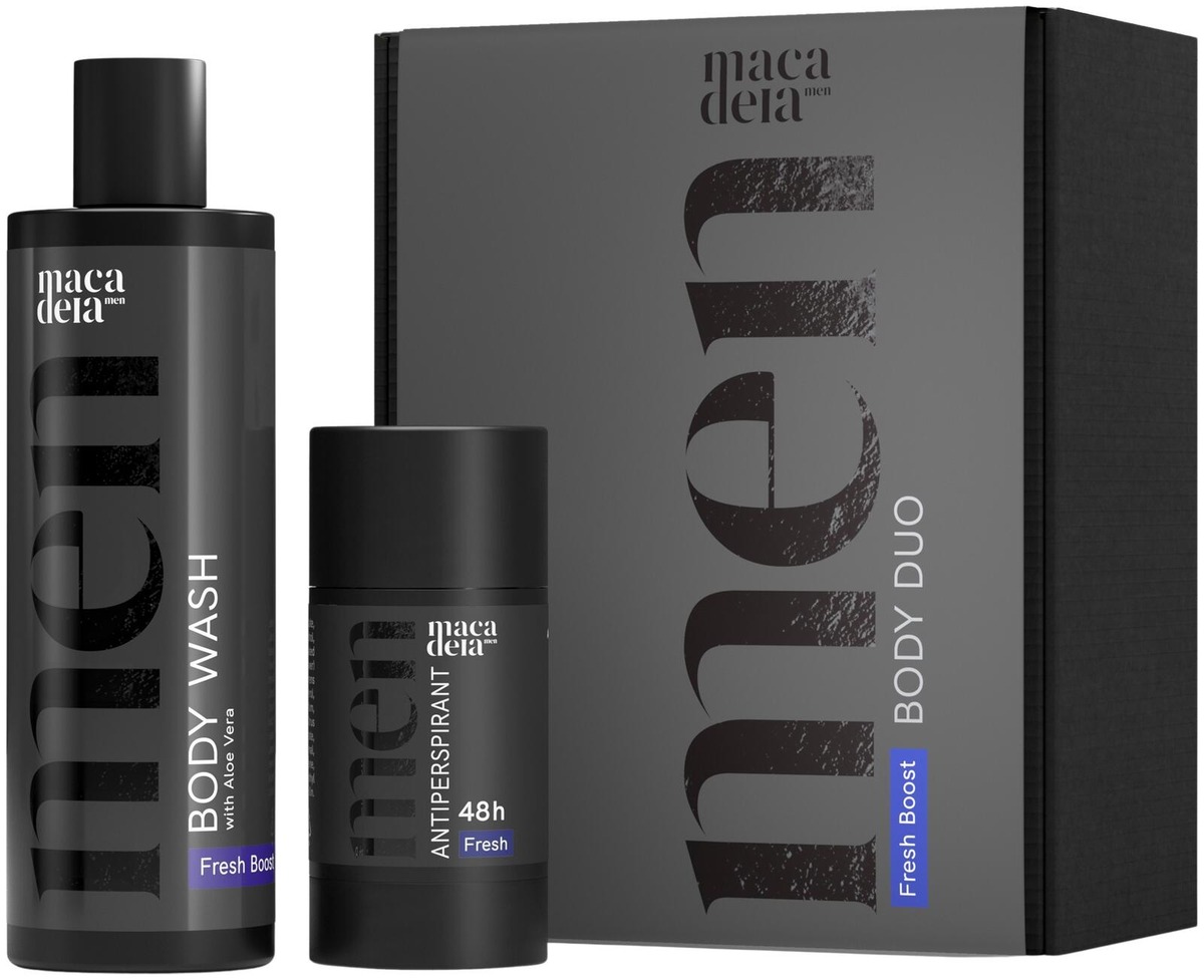 Lahjapakkaus sisältää Macadeia Men fresh boost suihkusaippuan sekä Macadeia Men 48h Fresh antiperspirantin.