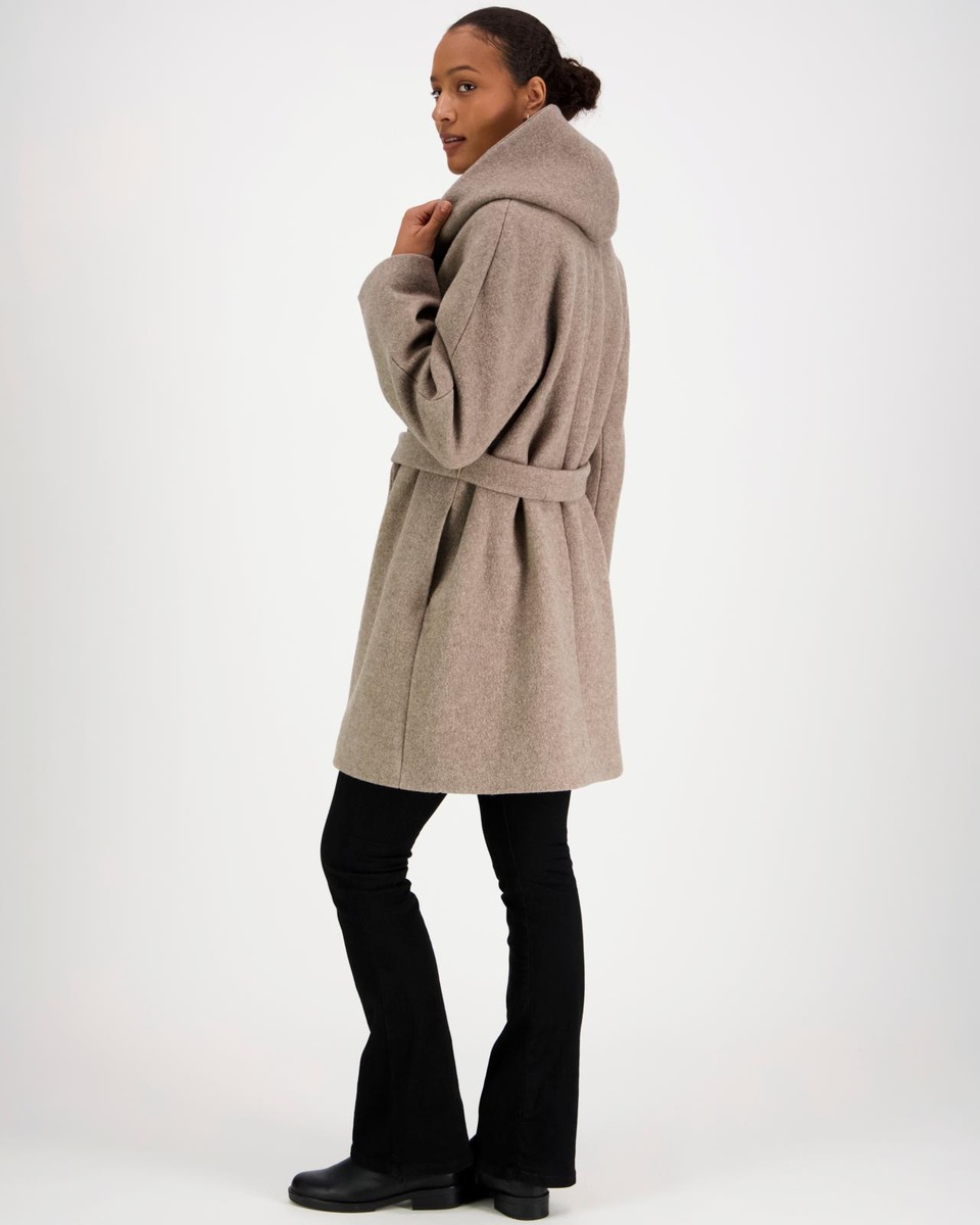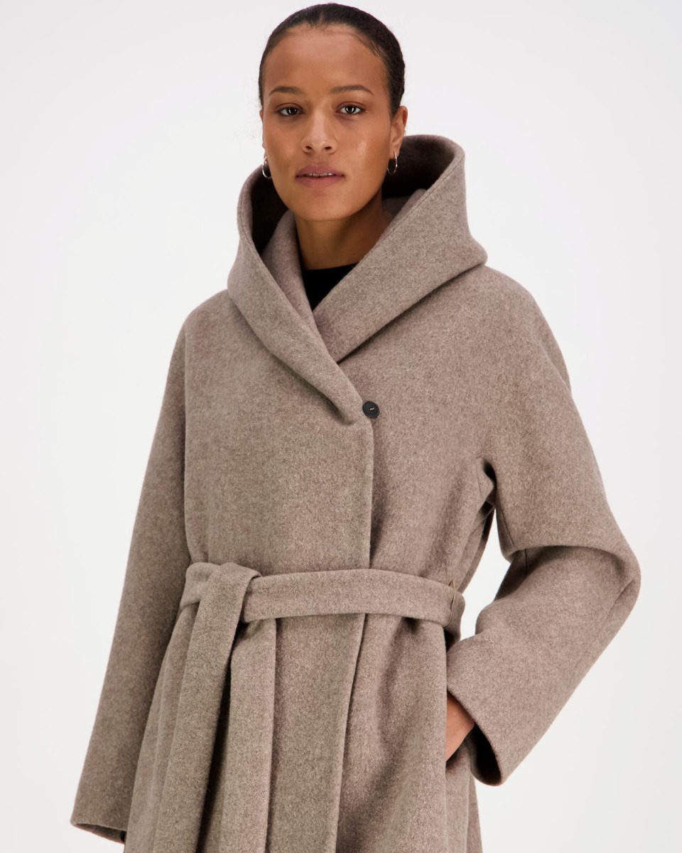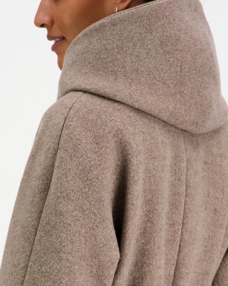 Vaivattoman minimalistinen kimonotyylinen hupullinen takki on valmistettu pehmeästä kierrätetystä villakankaasta. Rento siluetti, säädettävä vyö ja reilu huppu yhdistävät lämmön, mukavuuden ja hillityn eleganssin. Ajaton luottovaate tiedostavaan, moderniin elämään.