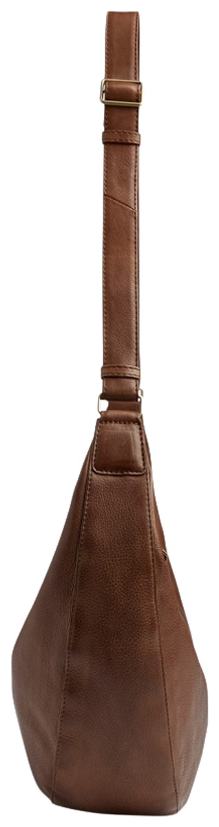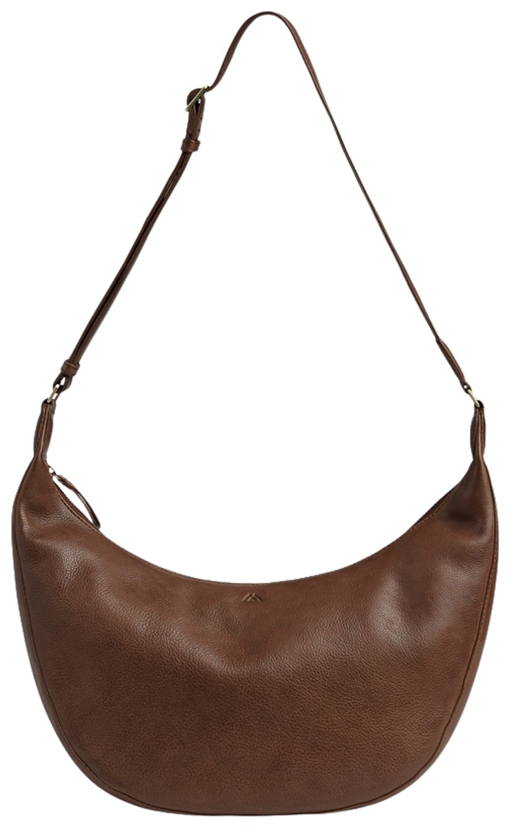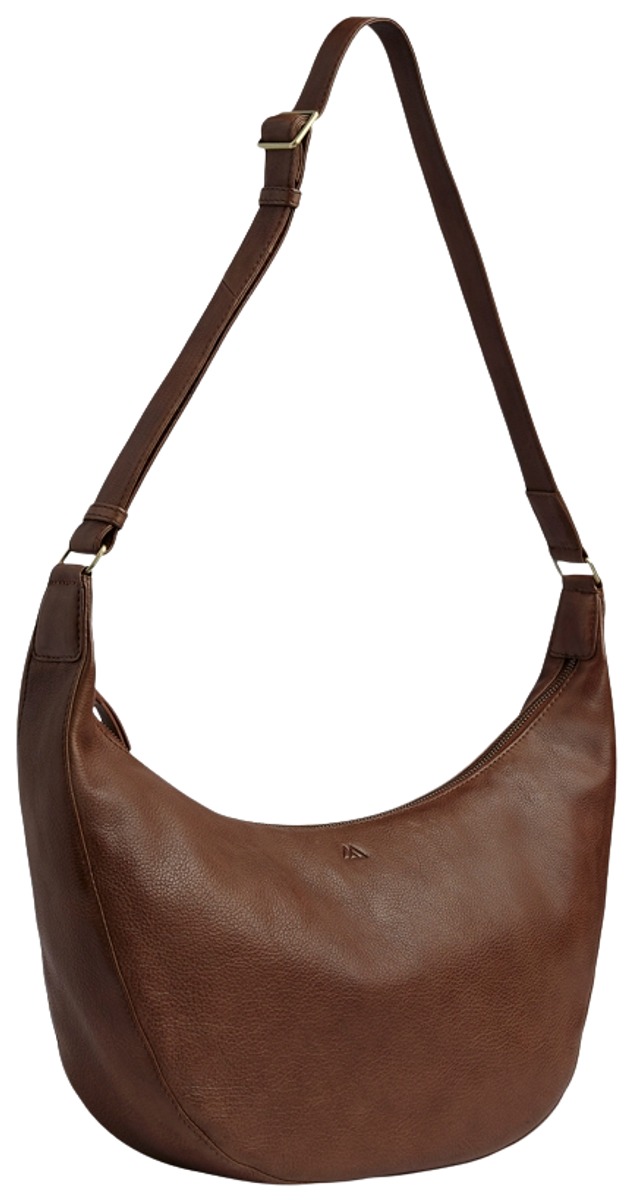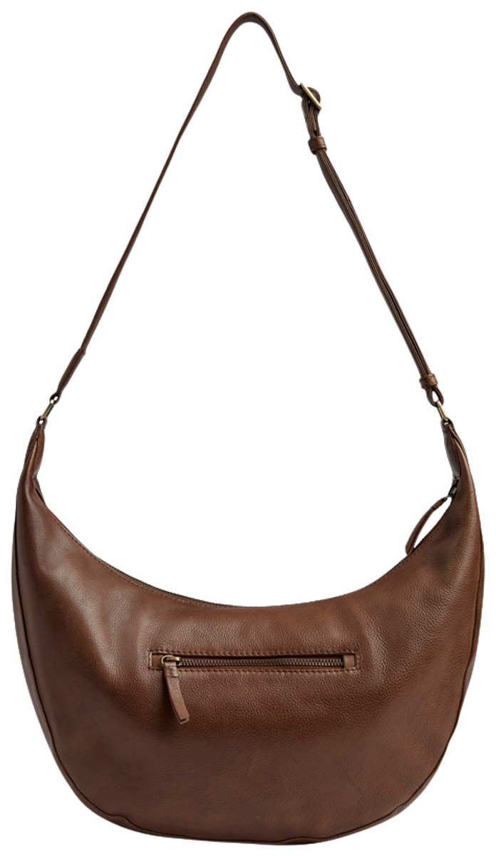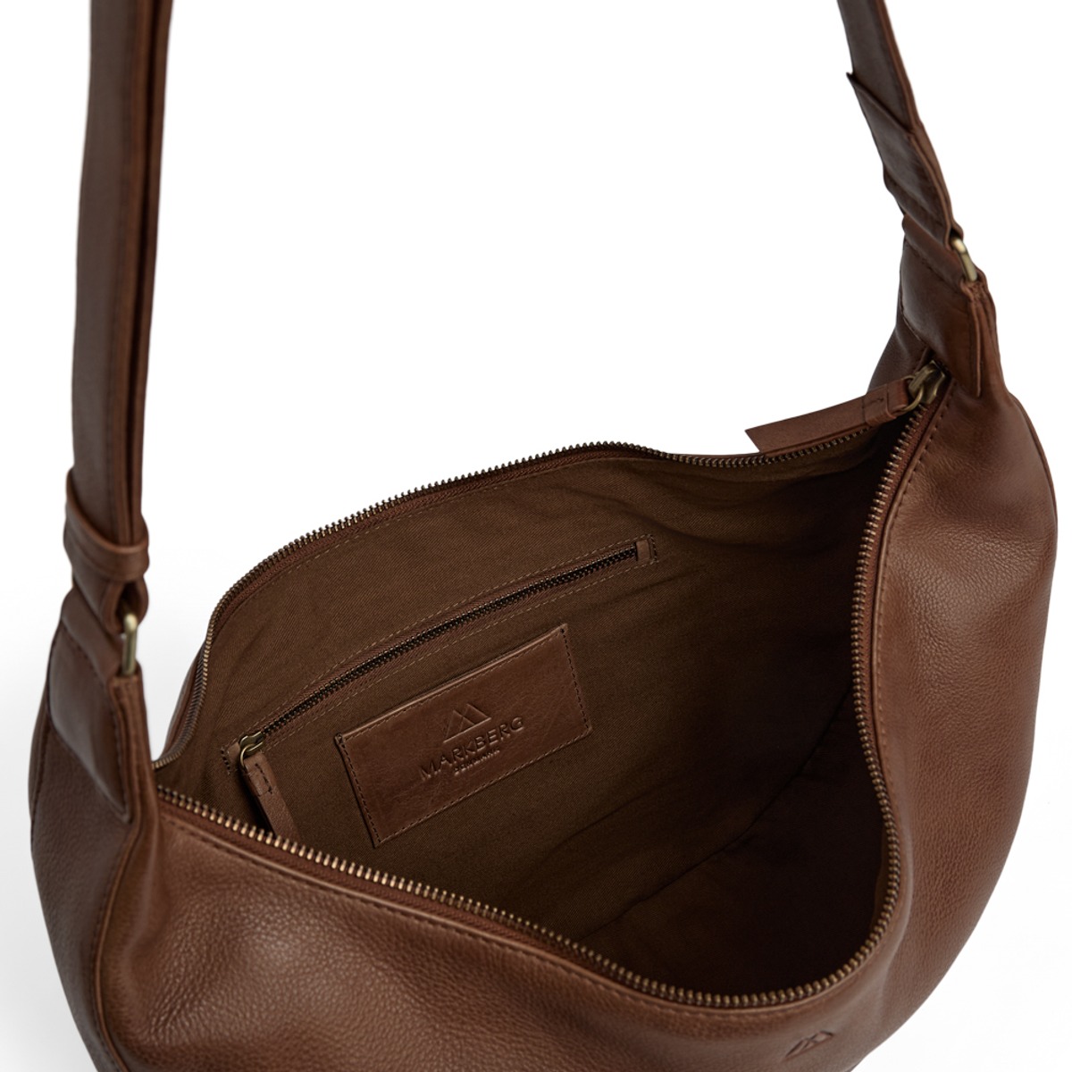 Tilava nahkainen olkalaukku, sisällä ja takana vetoketjutasku. Säädettävä olkahihna.Suljetaan vetoketjulla.