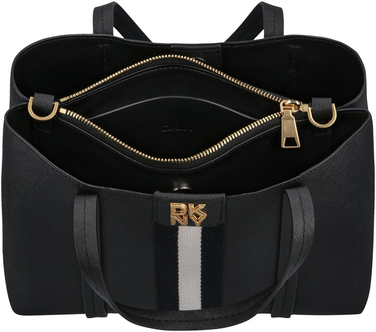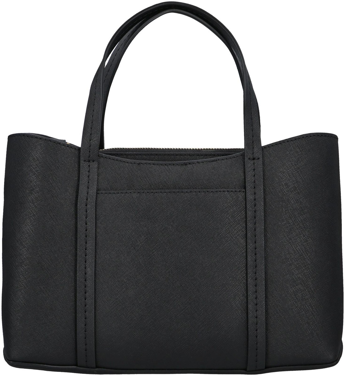 Saffiano nahkaisessa käsilaukkussa on keskellä pehmustettu vetoketjullinen lokero, jossa avotasku. Sivuilla nepilliset lokerot, takana avotasku. Kahvat ja irrotettava säädettävä olkahihna