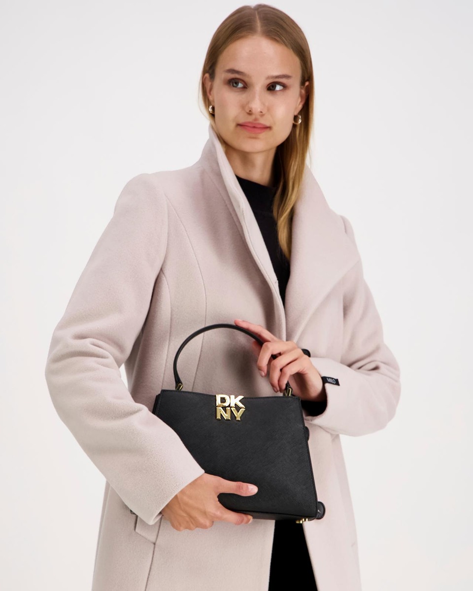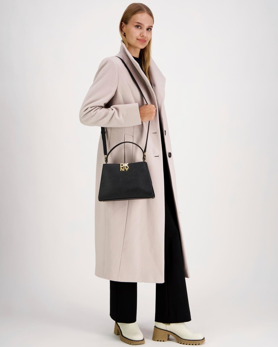 Saffiano nahkaisessa käsilaukussa on sisällä vetoketjutasku ja avotasku sekä takana avotasku. Kahva ja irrotettava säädettävä olkahihna. Nepillinen läppä. Laukun leveys on mitattu sen alaosasta