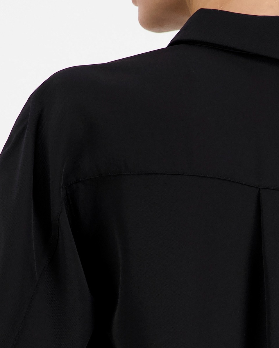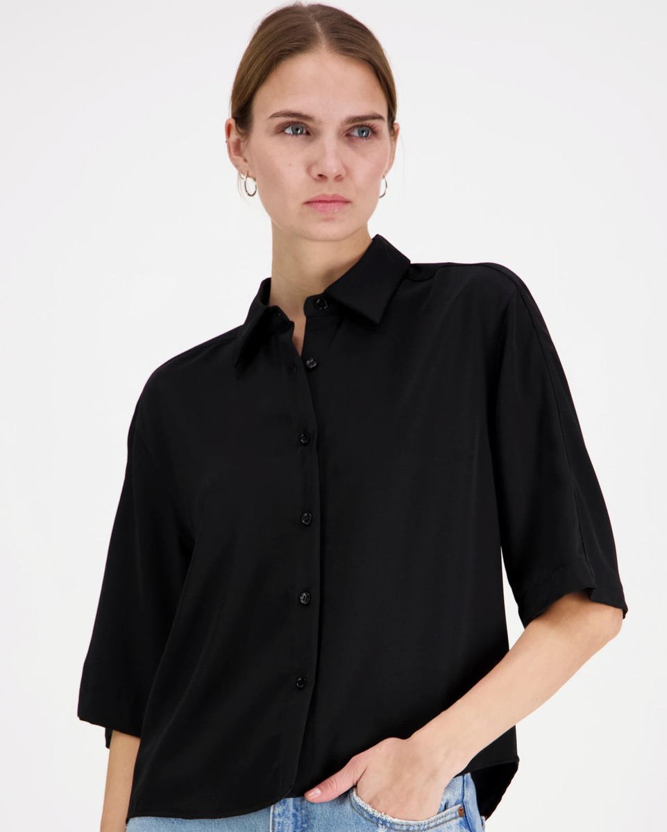 Samsøe Samsøen musta puolihihainen kauluspaita. Paita on valmistettu kierrätetystä polyesterista, mikä tekee siitä paitsi tyylikkään myös ympäristöystävällisen vaihtoehdon. Materiaalin ansiosta paita ei rypisty helposti, on kevyen tuntuinen päällä ja laskeutuu kauniisti. Puolipitkät hihat, väljä istuvuus ja pudotettu hartialinja luovat tyylikkään ja modernin ilmeen. Täydellinen pari suorille housuille tai hameelle. Paita sopii niin arkeen kuin juhlaan.