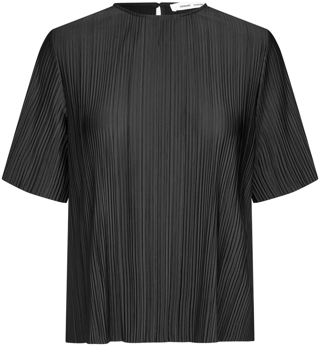 Samsøe Samsøen ribattu lyhythihainen paita. Paidan materiaali on kierrätettyä polyesteria, mikä tekee siitä paitsi tyylikkään myös ympäristöystävällisen vaihtoehdon. Materiaalin ansiosta paita laskeutuu kauniisti päällä, on mukava ja hengittävä eikä ryppyynny helposti. Paita sopii niin arkeen kuin juhlaan, ja voi käyttää pelkästään tai kerrostaen bleiserin alle.