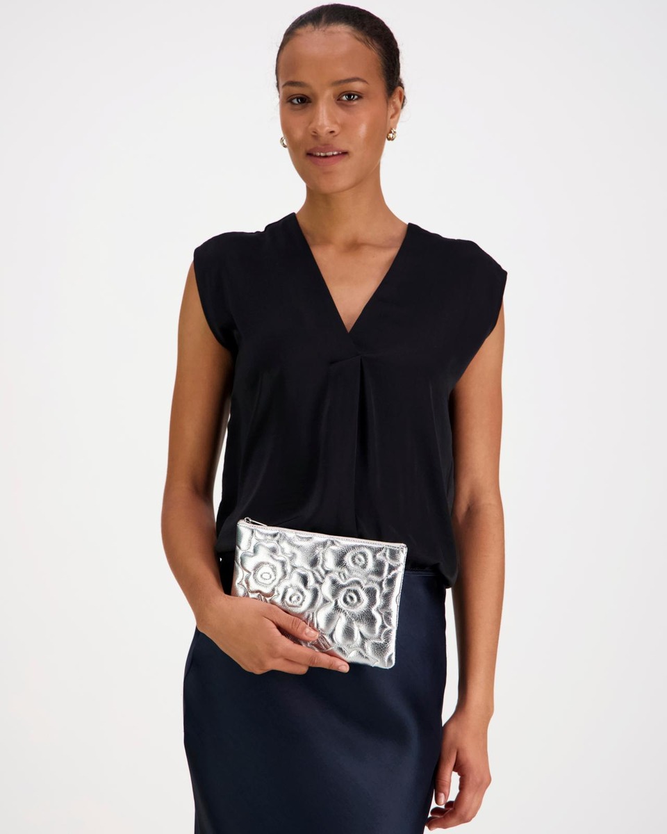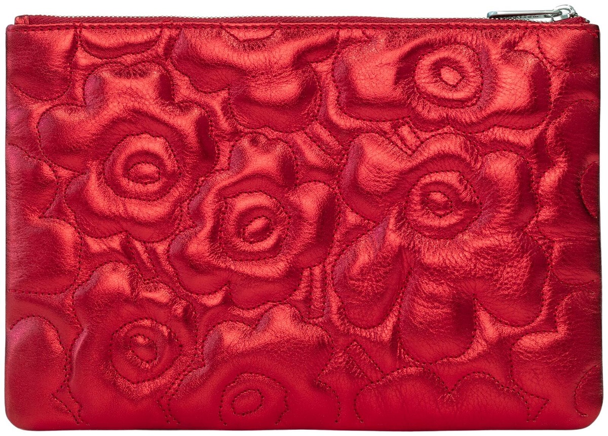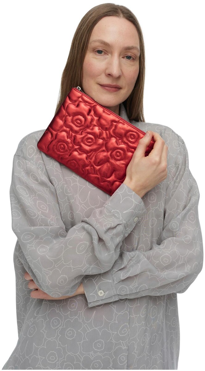 Pouch Bag -käsilaukku on valmistettu pehmustetusta nahasta, jossa on metallinhohtoinen pinnoite ja johon on tikattu Unikko-kuosi. Käsilaukussa on vetoketjusuljenta ja sisäpuolella yksi avoin tasku. Tuotteen päämateriaali on nahkaa. Sisävuori on valmistettu 100-prosenttisesta kierrätetystä polyesterista.Metallinhohtoisissa nahkatuotteissa näkyy ajan kuluessa luonnollista patinaa. Marimekko on Leather Working Groupin (LWG) jäsen. LWG on sitoutunut kehittämään vastuullisempaa nahan valmistusta. Luovuutta ja rohkeutta symboloiva Unikko syntyi aikana, jolloin Marimekon kuviomaailmaan ei juuri kuulunut kukkia. Maija Isolaa kukka-aihe kuitenkin kiinnosti, ja hän päätti suunnitella kokonaisen sarjan uudenlaisia vahvoja kukkakuoseja.