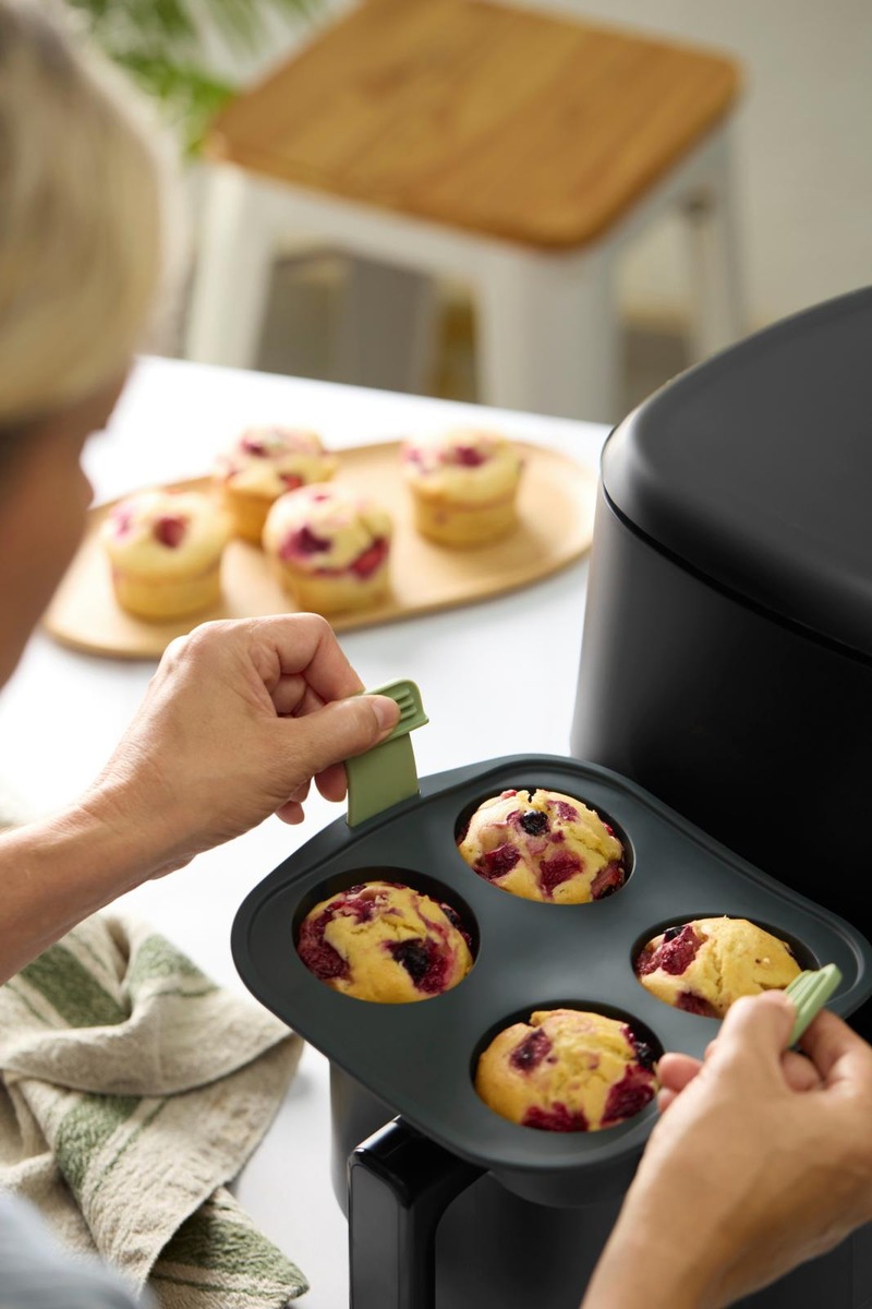 Nauti herkullisten ja kuohkeiden muffinien leipomisesta tällä air fryer vuoalla. Vuoka on helppo nostaa pois ulosvedettävien, liukumattomien kahvojen ansiosta. Valmistettu 100 % platinasilikonista, jonka ansiosta muffinit irtoavat vaivattomasti. Sopii vähintään 5 litran air fryereihin.