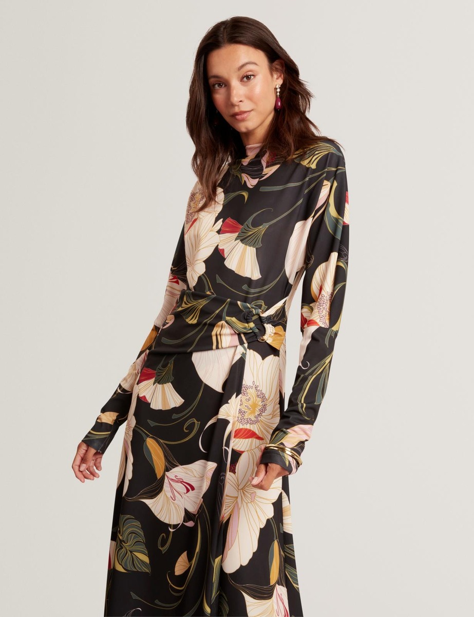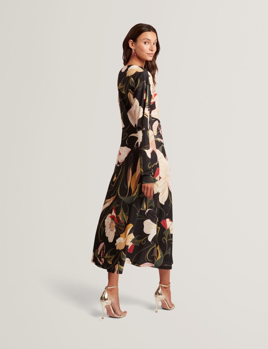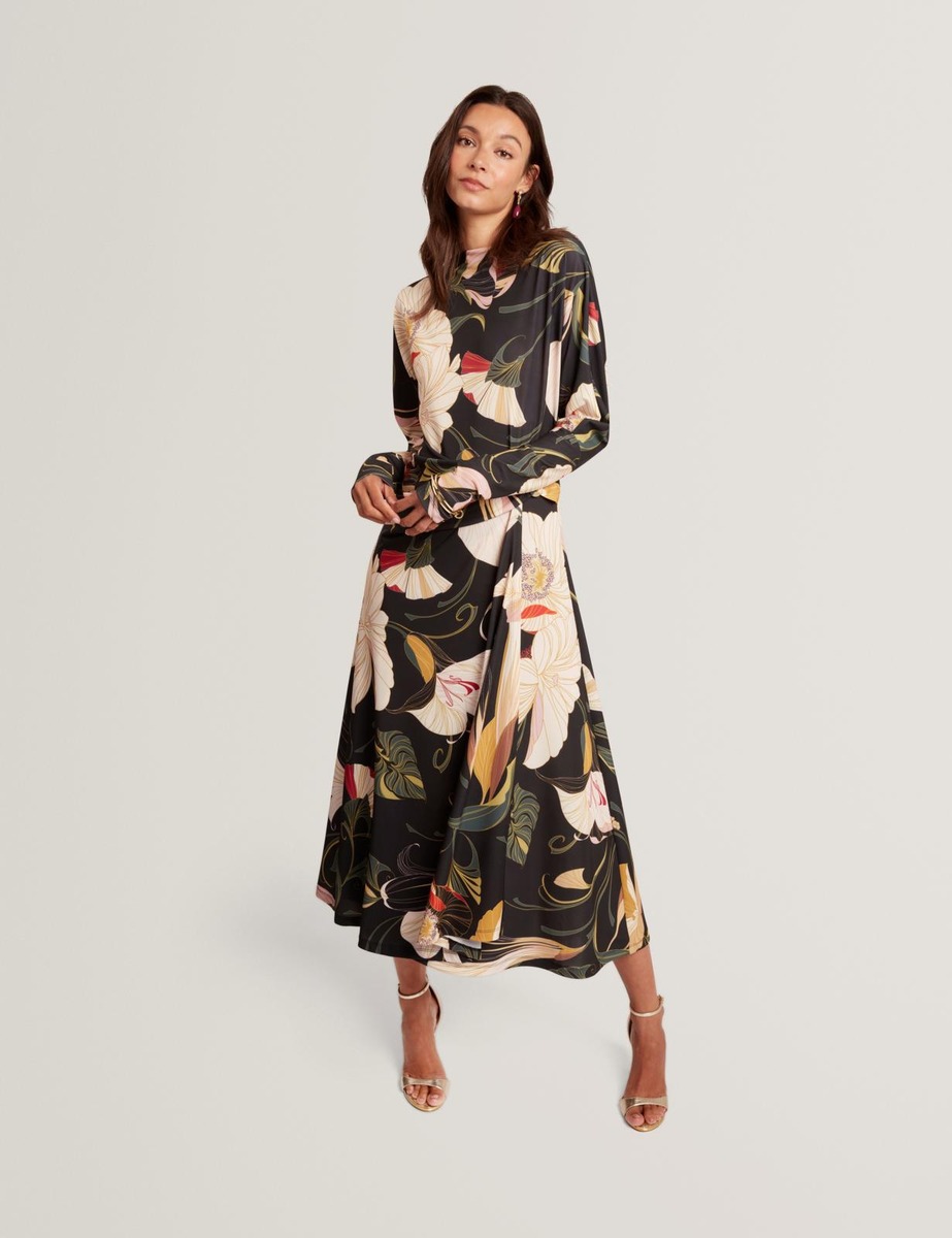 Pitkähihainen mekko, jossa upea kukkaprintti ja kaunis solki edessä.