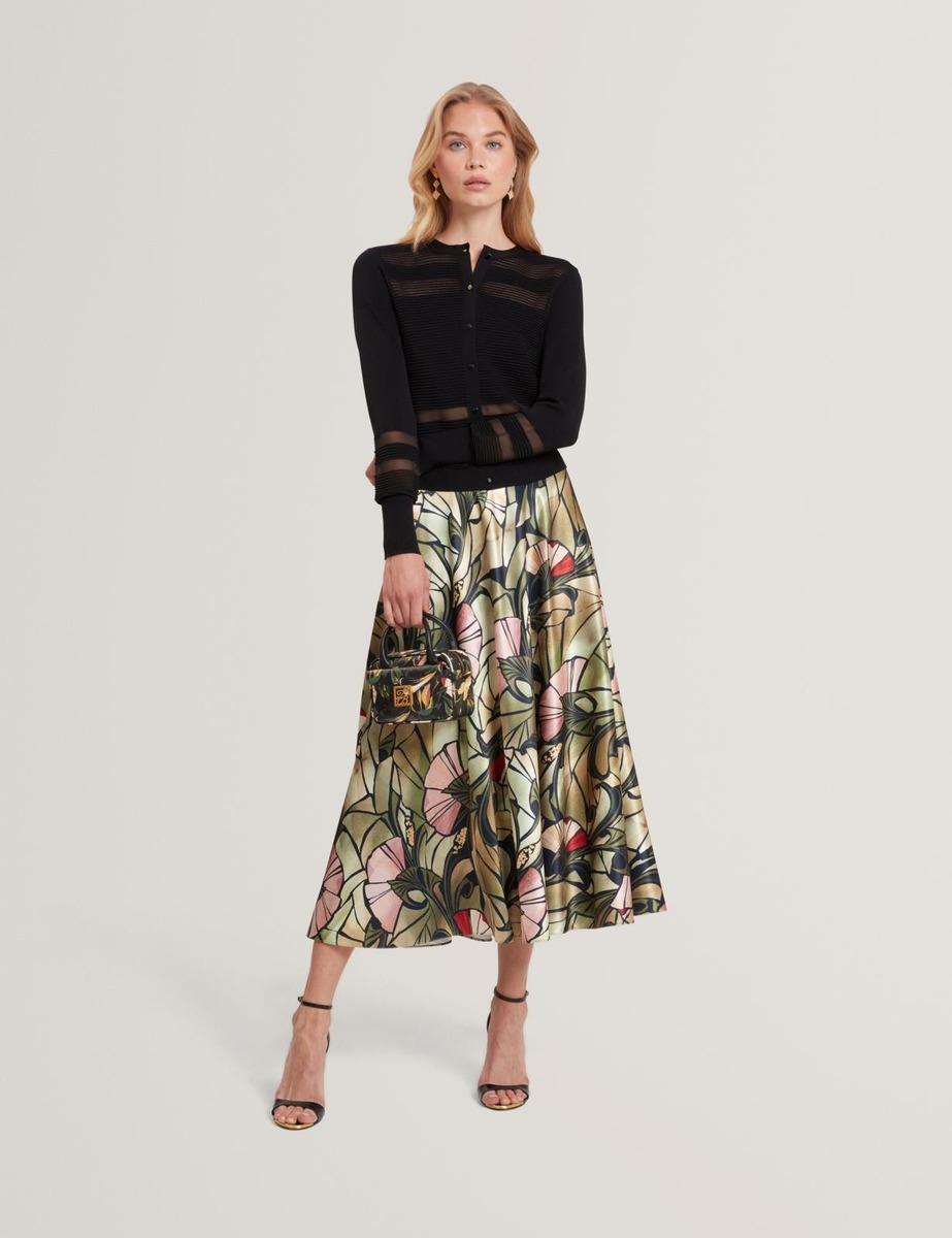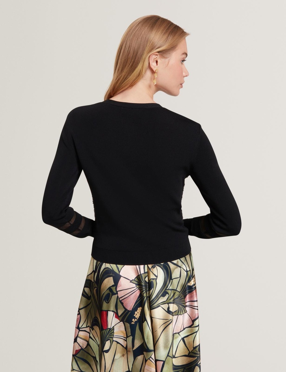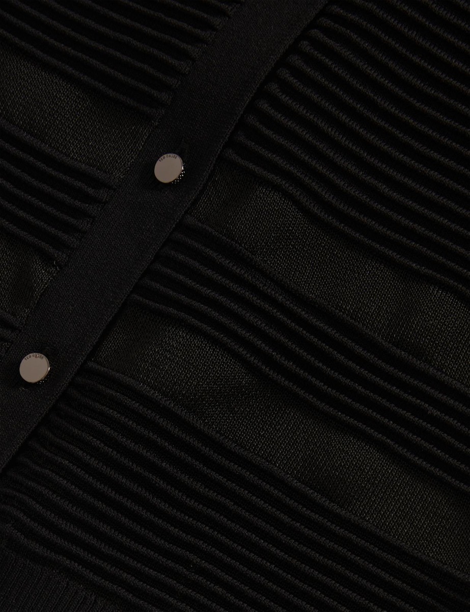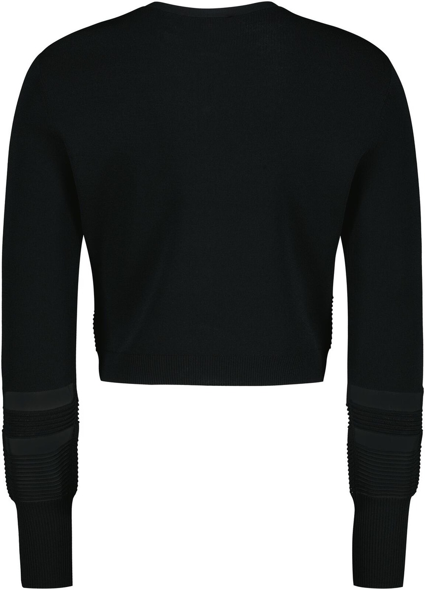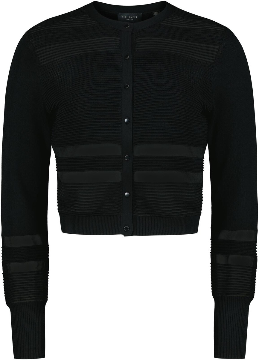 Neuletakki jossa hieman läpikuultavaa ribattua neulosta edessä.