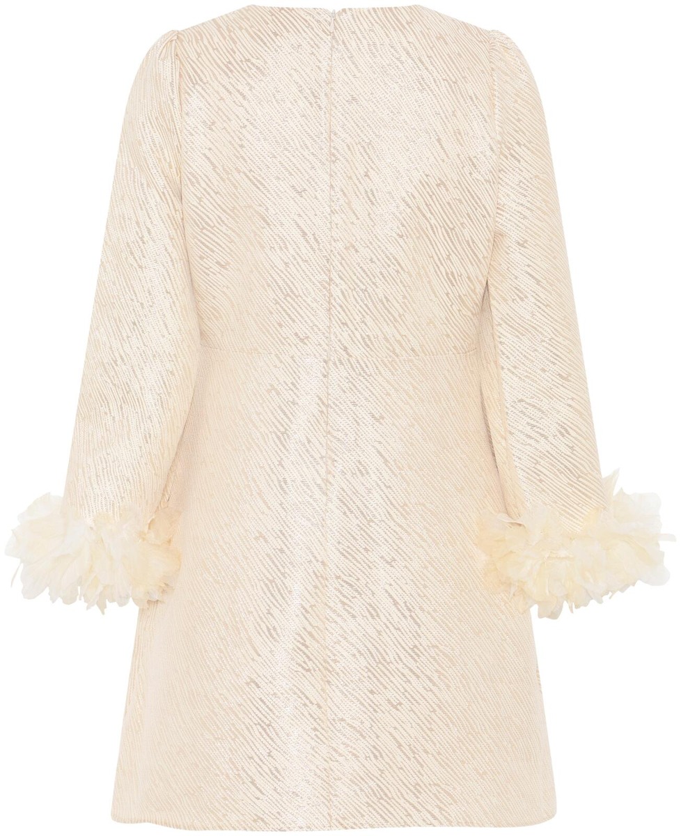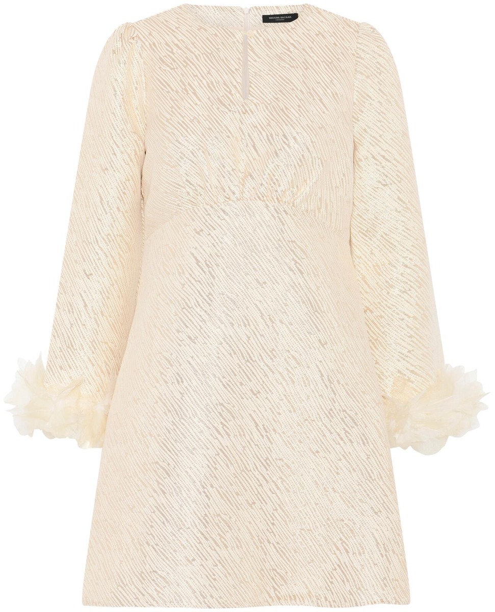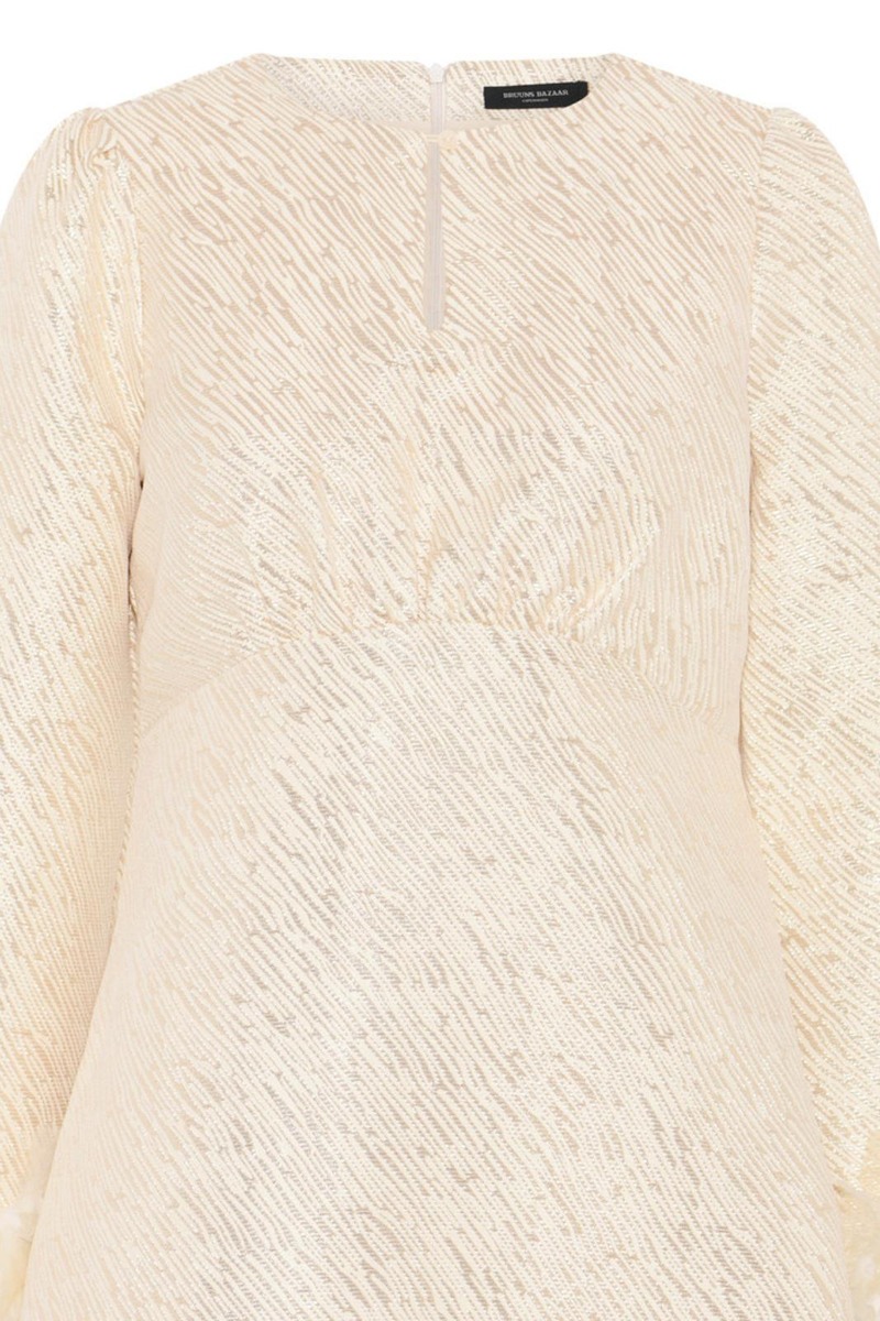 Bruuns Bazaar Cocos Bulja mekko henkii vanhan ajan glamouria. Mekon materiaali on pehmeän kullanhohtoinen, ja trrumpettimaisten hihojen koristeena on käytetty sifonkia. Malli on klassinen ja aavistuksen a-liinjainen, pituus polveen.