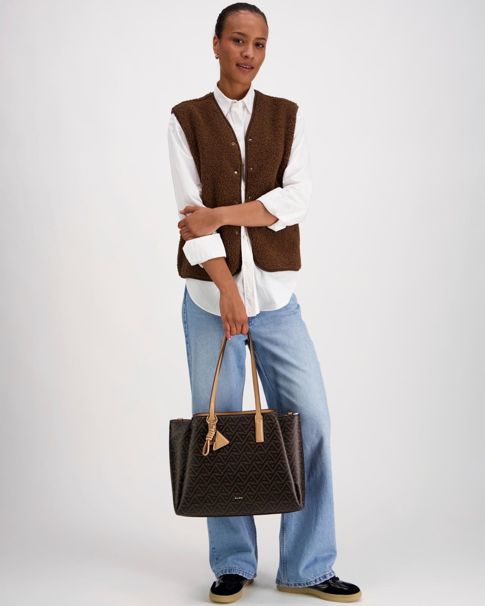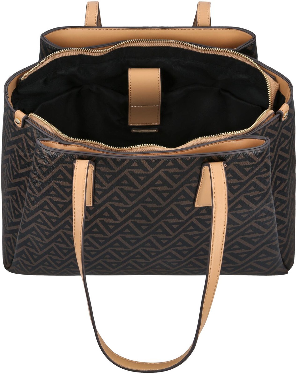 Keinonahkainen olkakassi logokuvioinnilla. Keskellä vetoketjullinen lokero, sivuilla nepilliset lokerot.