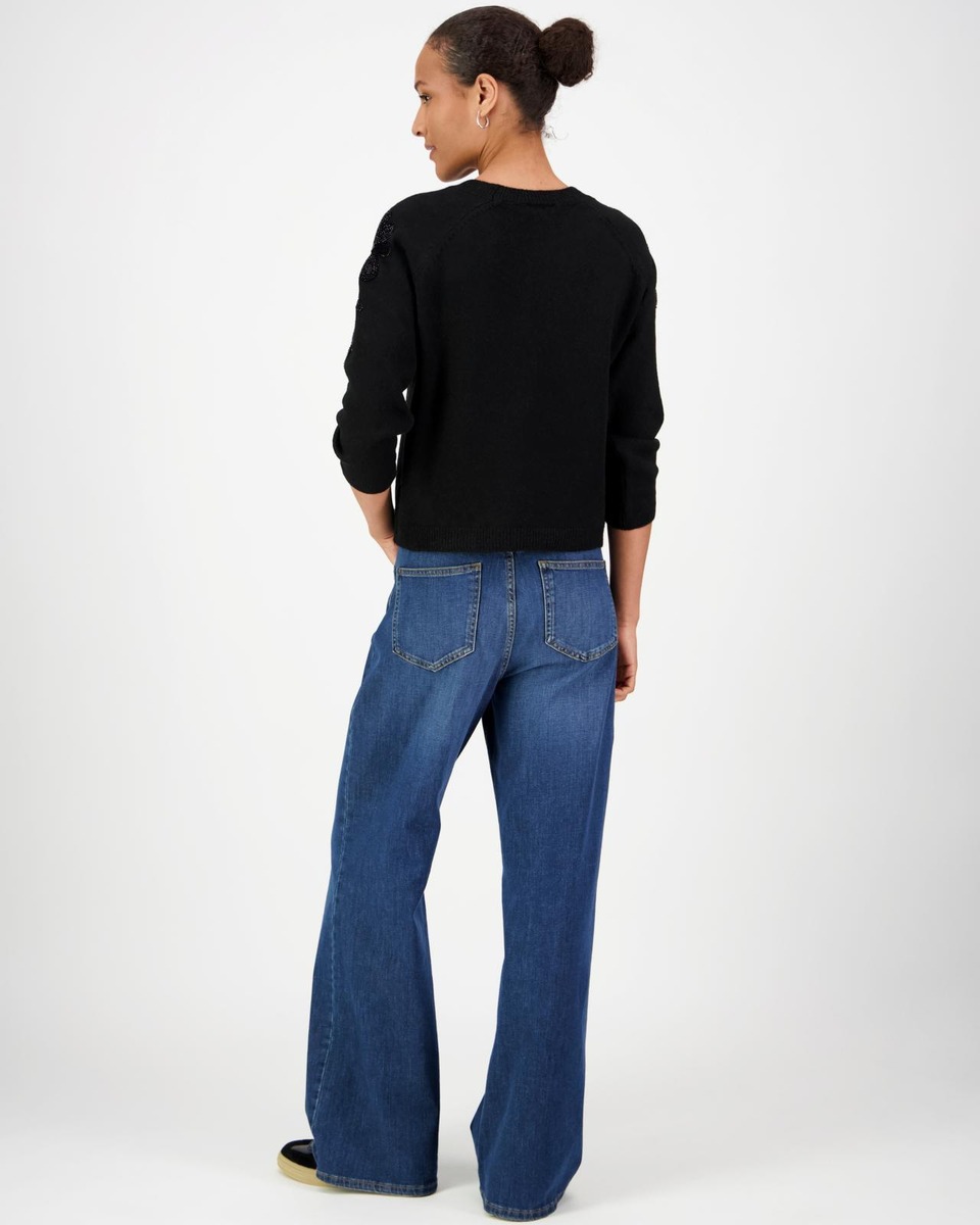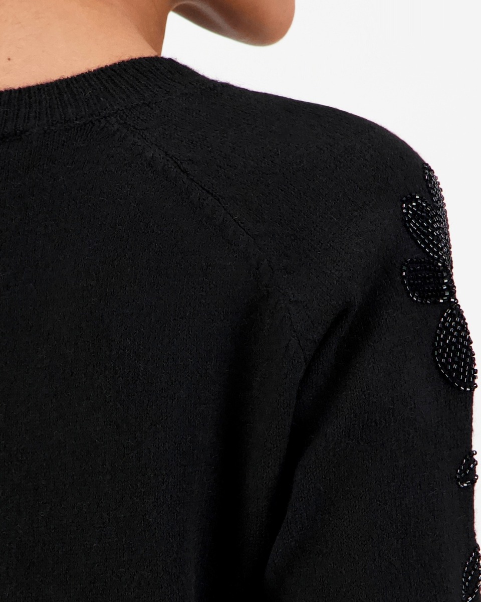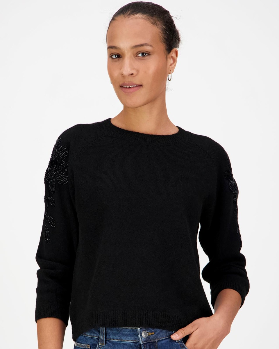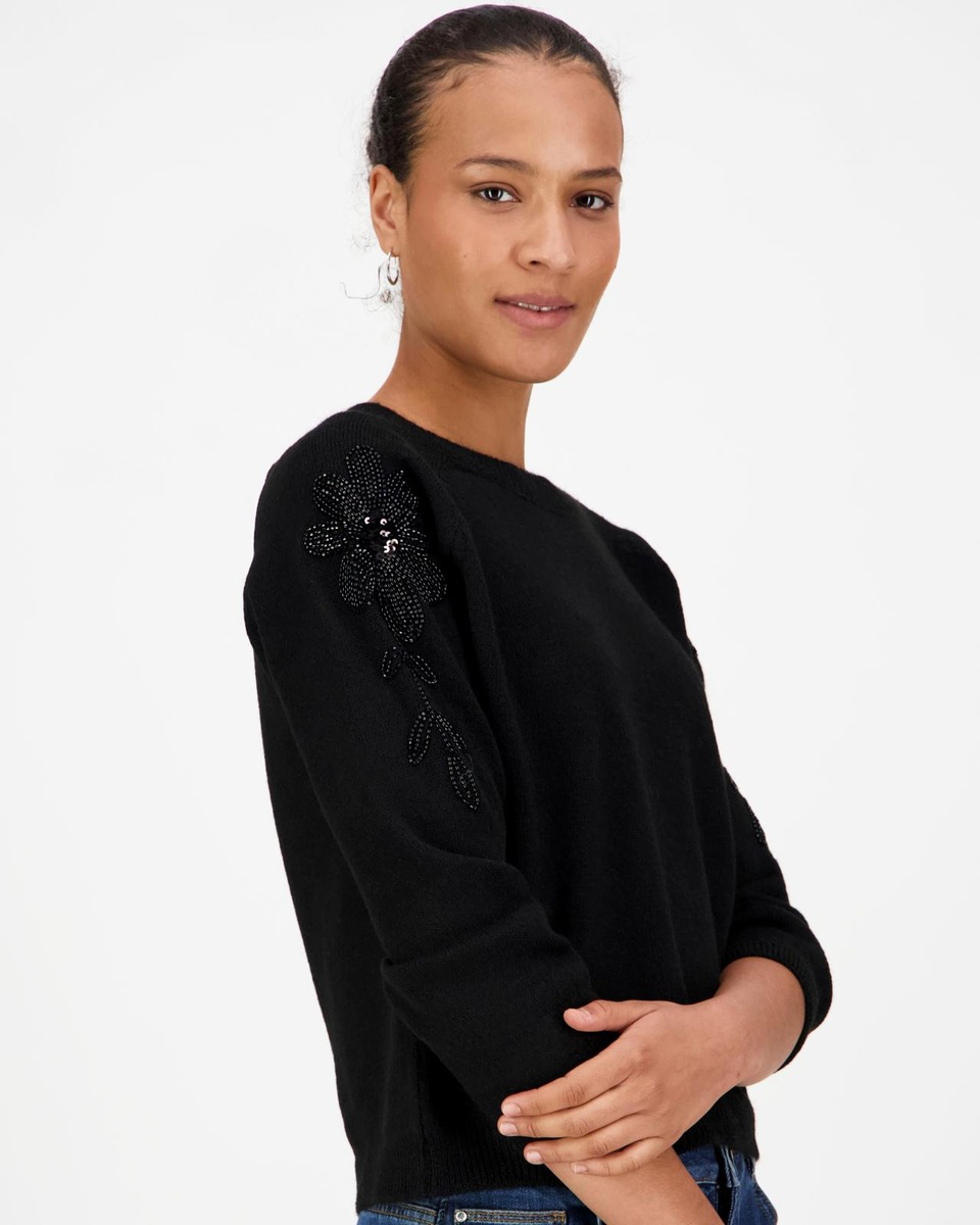 Juhlava neulepusero, jossa on 3/4 hihat.Olkapäällä upea kukkakoristinen strassisomiste.Neuletta löytty kahdessa värissä, kaunis kerma ja musta.