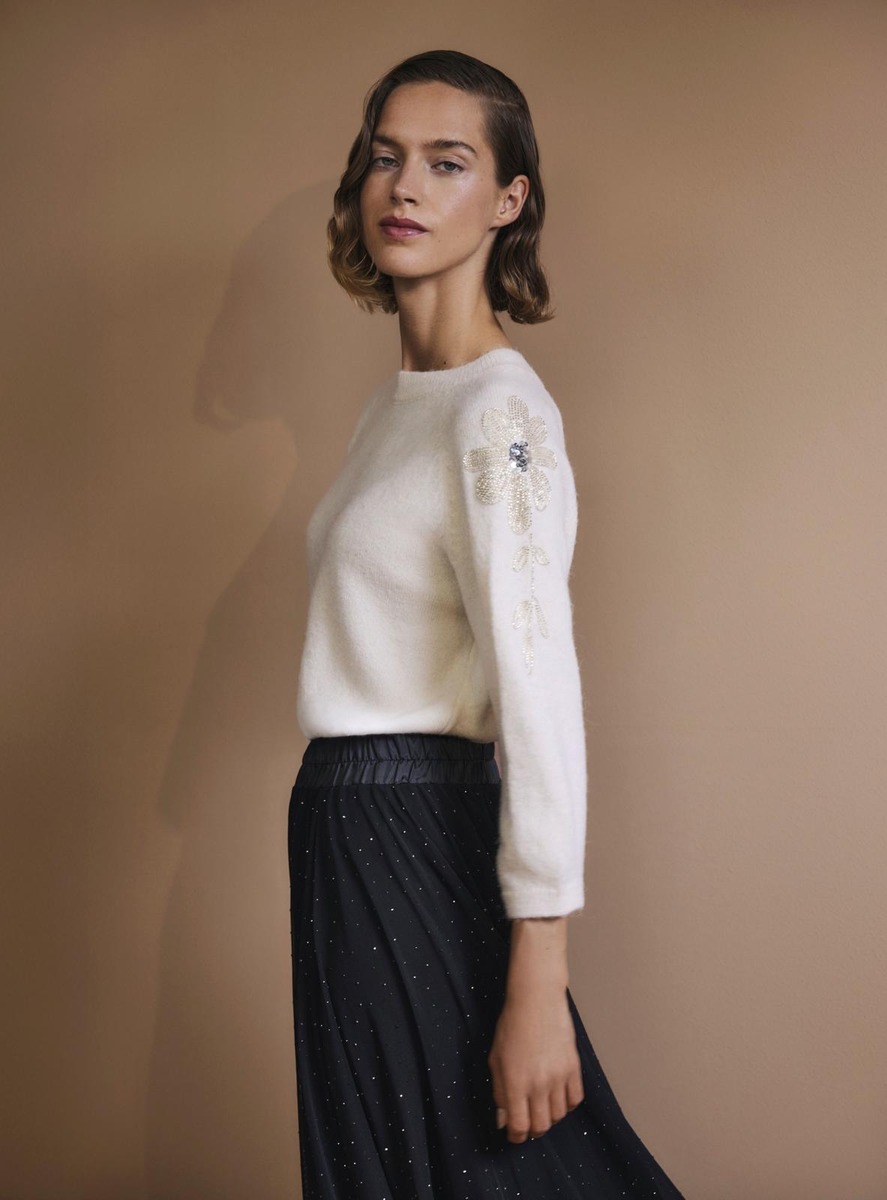 Juhlava neulepusero, jossa on 3/4 hihat.Olkapäällä upea kukkakoristinen strassisomiste.Neuletta löytty kahdessa värissä, kaunis kerma ja musta.